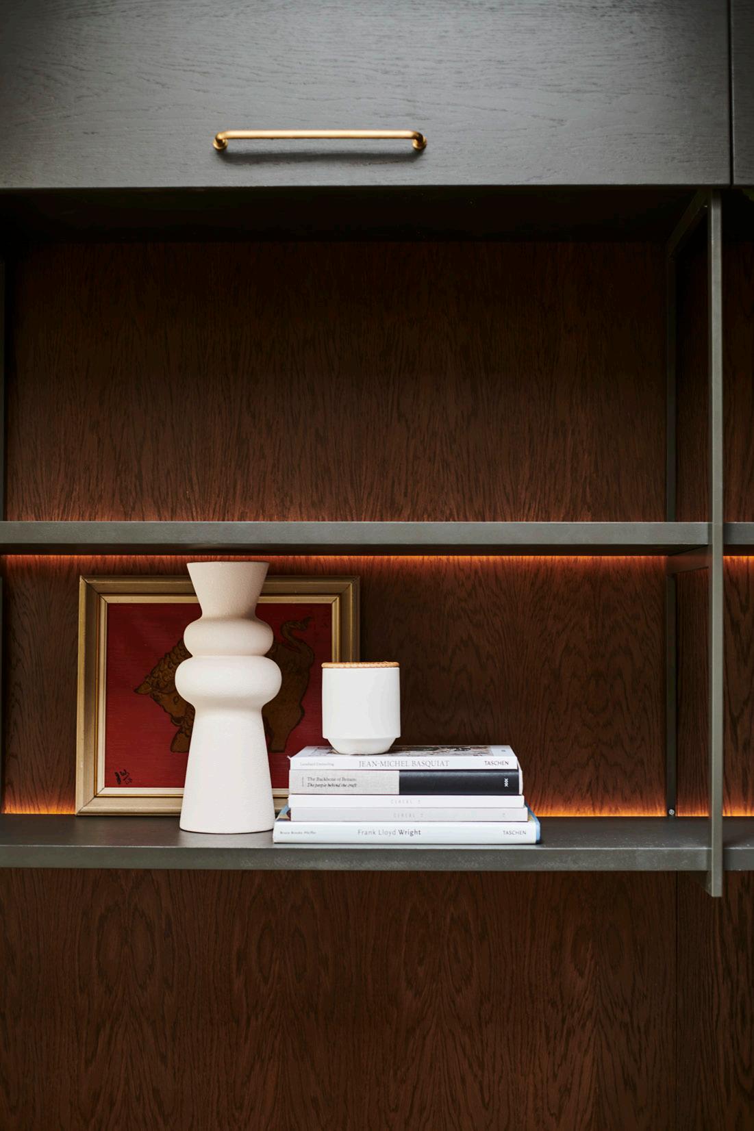 We work closely with a local metal fabricator to create bespoke shelving that compliments our joinery. This metal-framed shelving unit includes hidden warm-fused LED lighting.