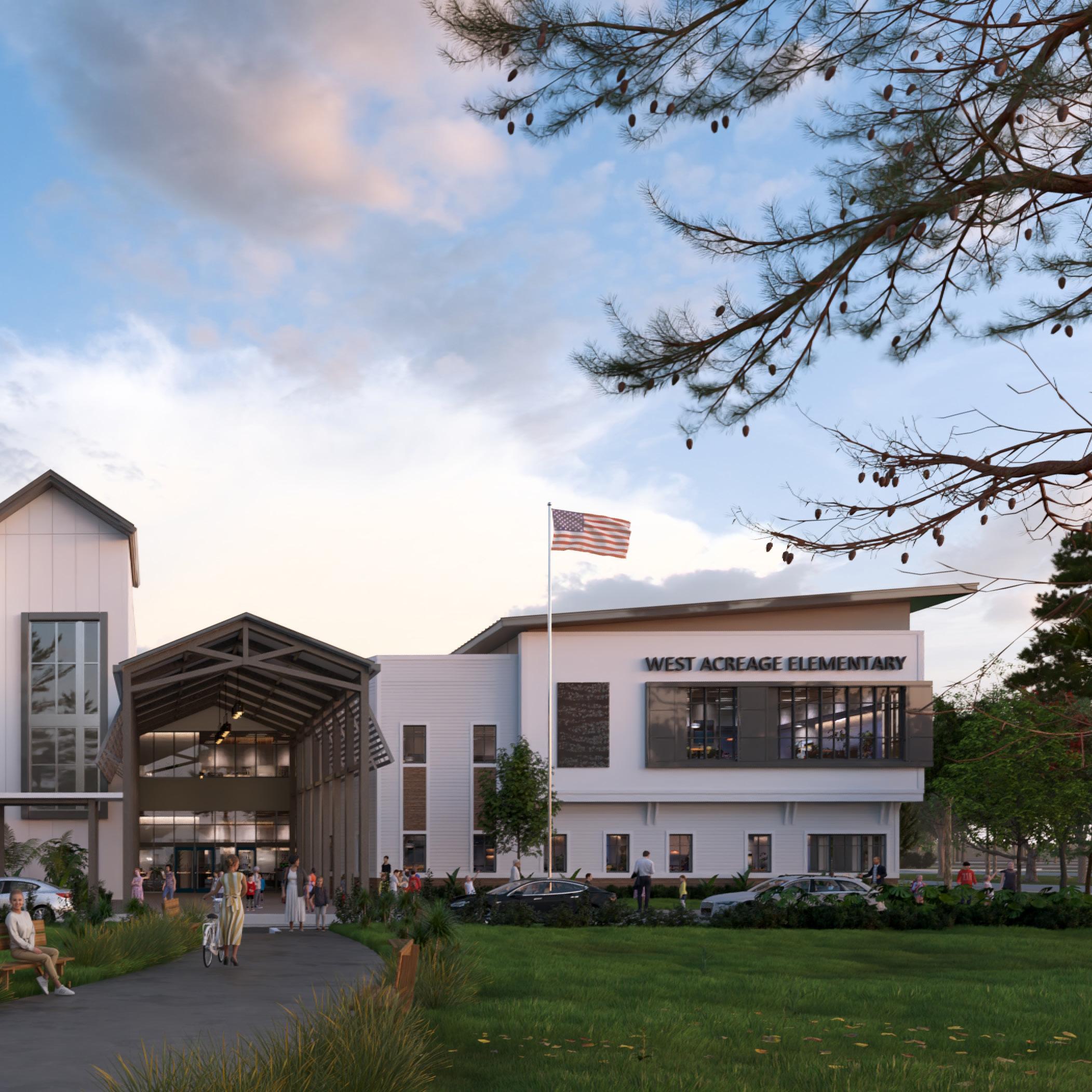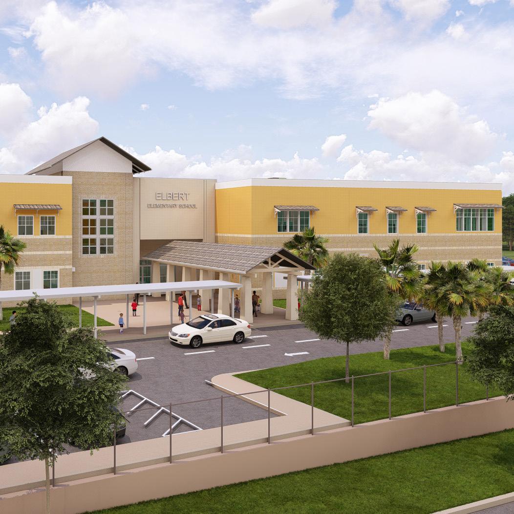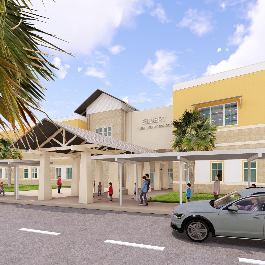 Multi-story prototype design that ranges from 970 to 1,200 student stations Elbert Elementary is new state of the art 21st century learning elementary prototype for Polk County Public Schools, ranging from 970 to 1,200 student stations, that serves as a municipal epicenter for a new and growing community. The campus will provide two separate entrances and loops for buses and parent pick-up and drop-off. The parent dropoff loop will enter and exit from the southeast along Dundee Road. Queuing allows for 200 cars (200 recommended which includes a 20% factor), while keeping most traffic onsite.