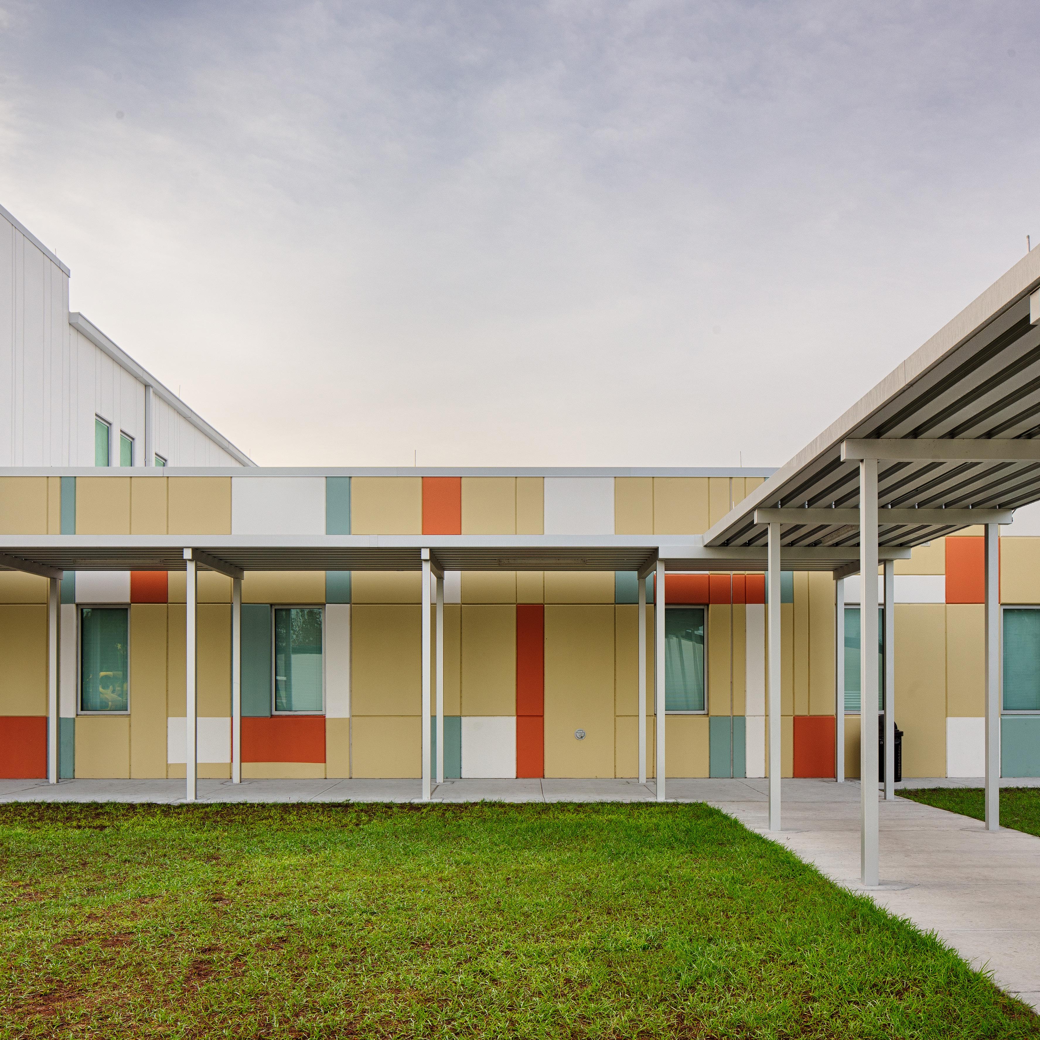 The modular, two story PK 5 elementary school responds efficiently to the requirements of its intended compact, urban site, as well as to the educational challenges faced by urban community schools. The school was designed in conjunction with community partners to provide services that were lacking within the surrounding neighborhood; for example, the elementary school was modified to accommodate an additional “plug-in” building for the school’s ESE program, which caters to autistic children.