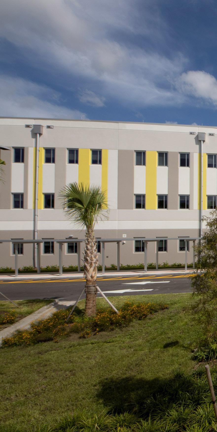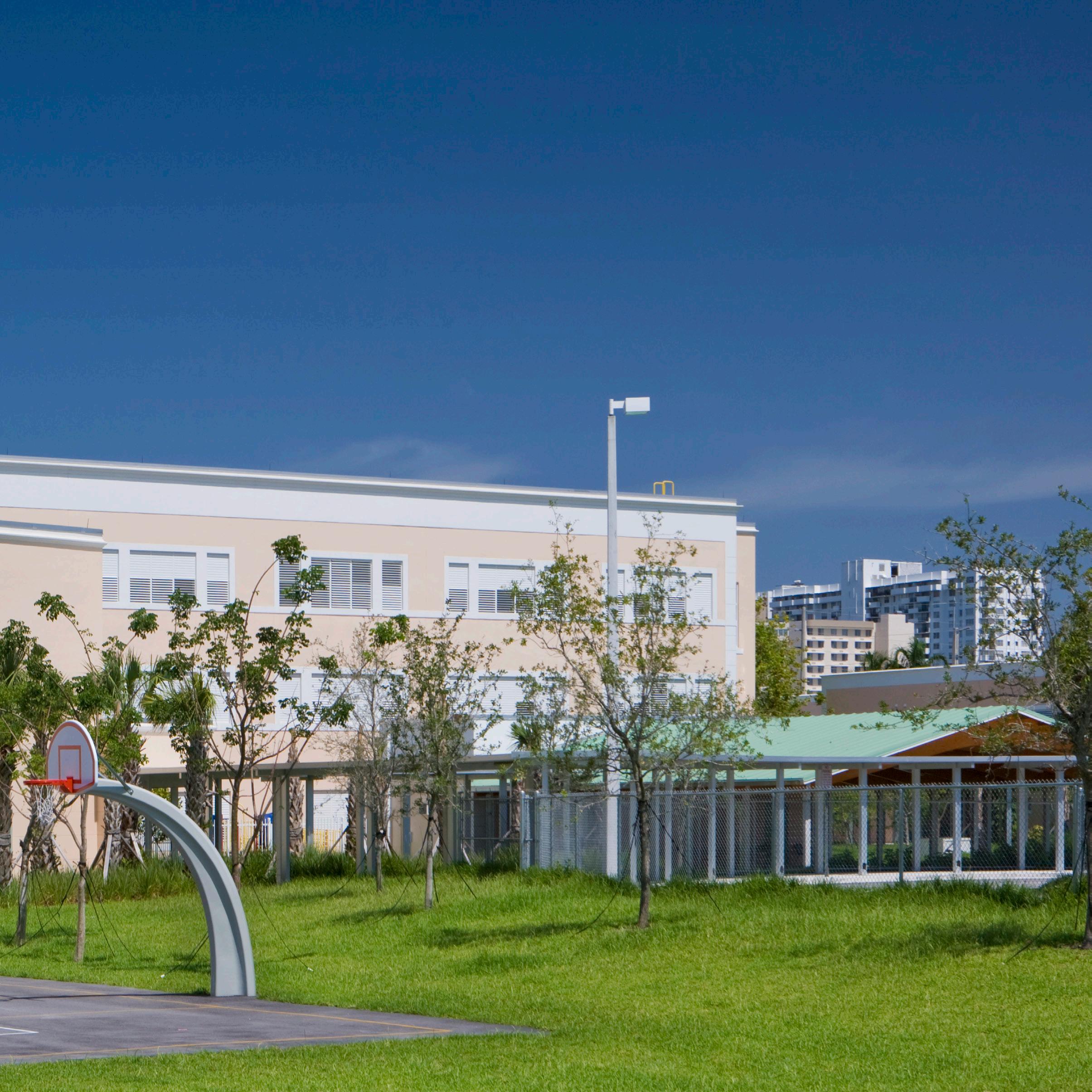 Ojus Elementary is an urban school on a small site in North Miami Beach. Stratus was commissioned to perform a campus master plan and design services for a 538 student station classroom addition. The firm first confirmed the educational program and improvements required by the project. The final scope of work comprised a new three story facility with a new prototype kitchen/ dining facility and 27 classrooms, additional staff parking and reconfiguration of the existing staff parking lot, the replacement of the existing P.E. Shelter, new play ground equipment, two new basketball courts, and upgrade of the existing electrical service.
