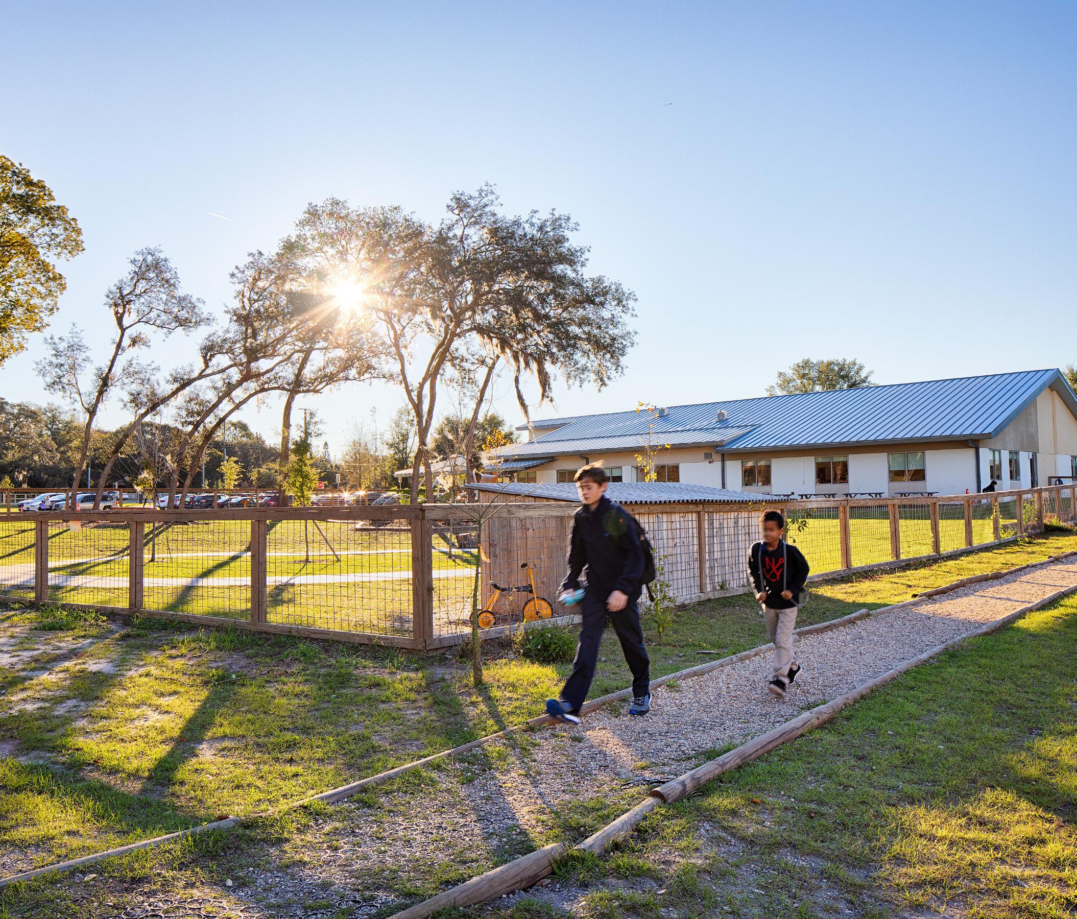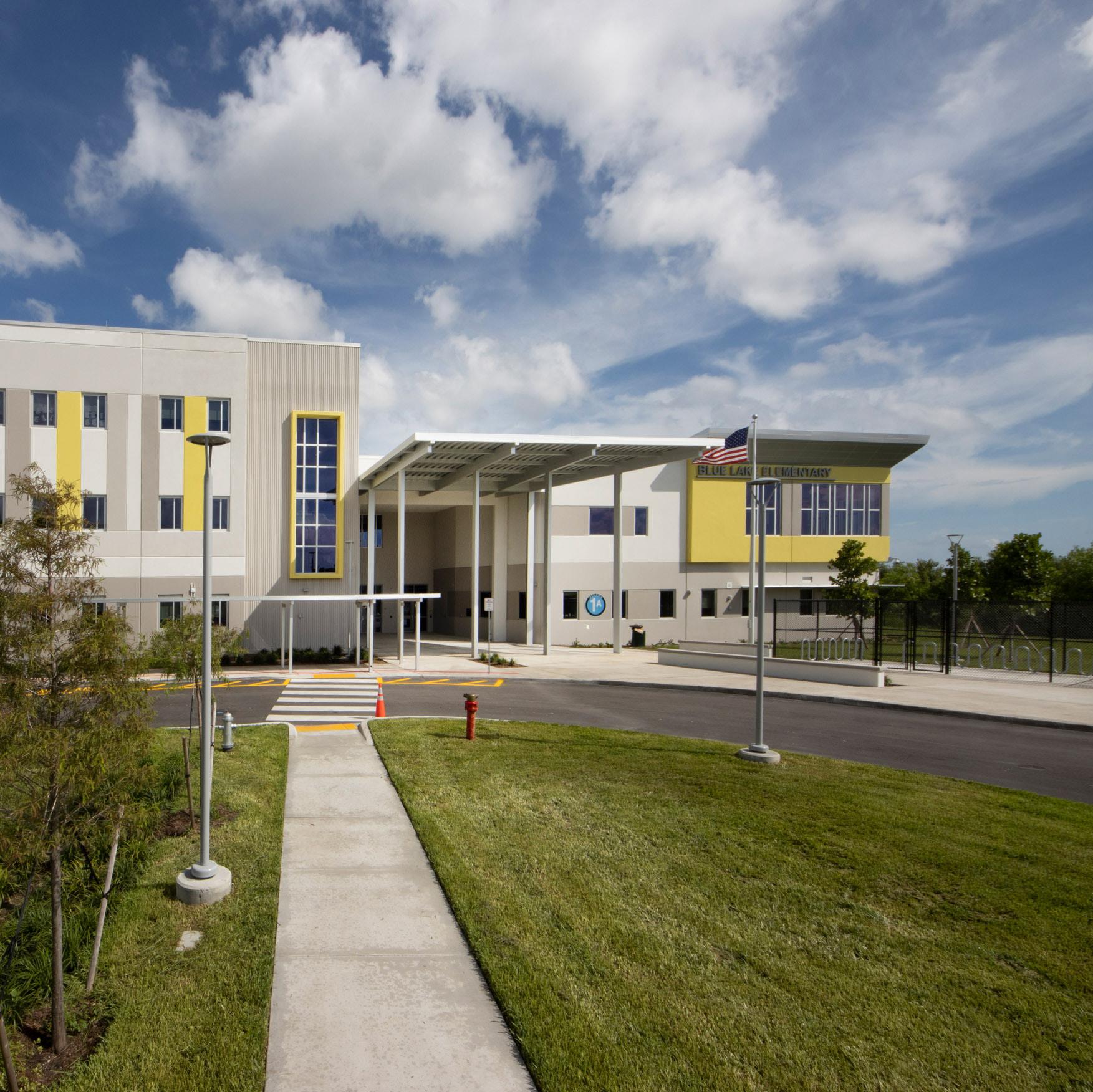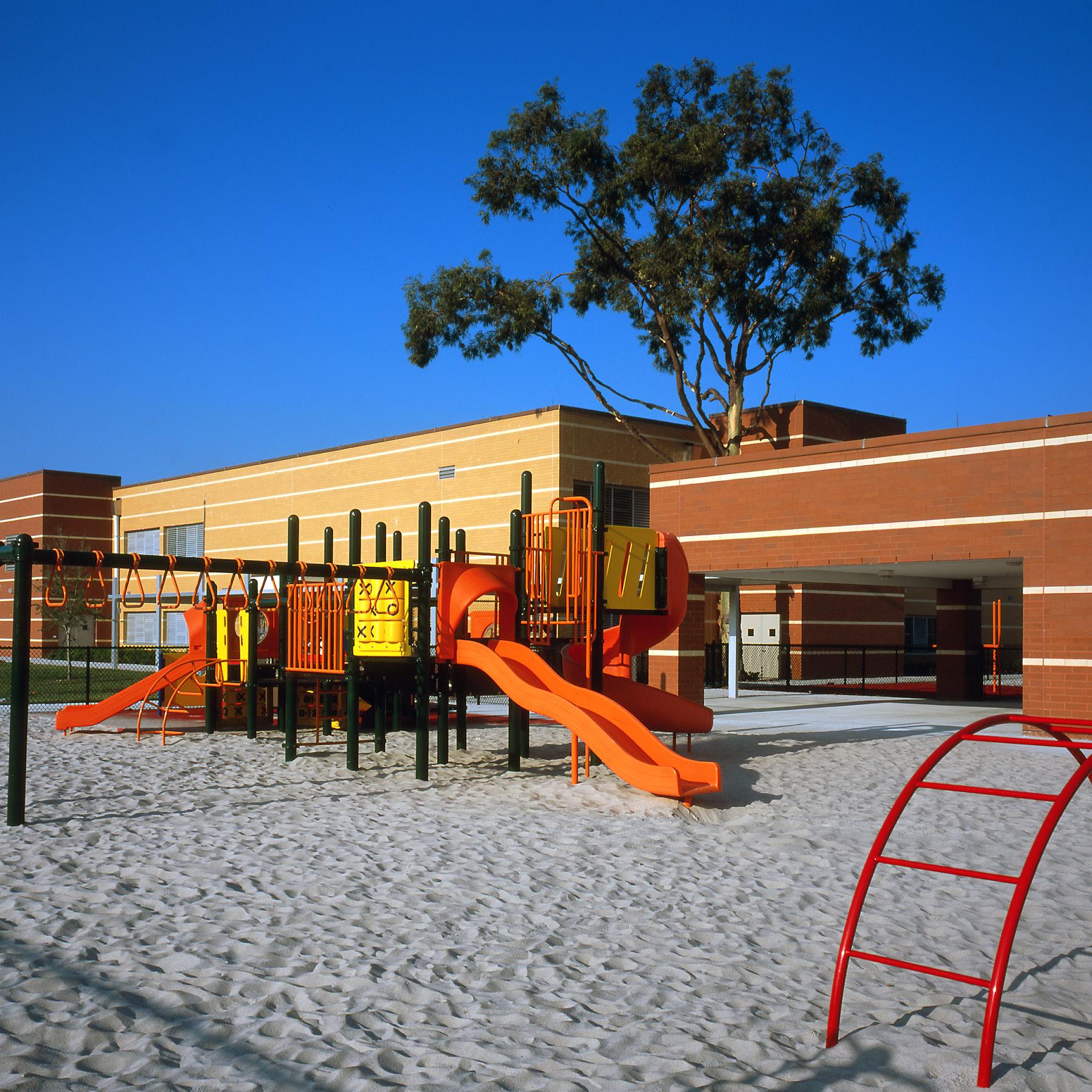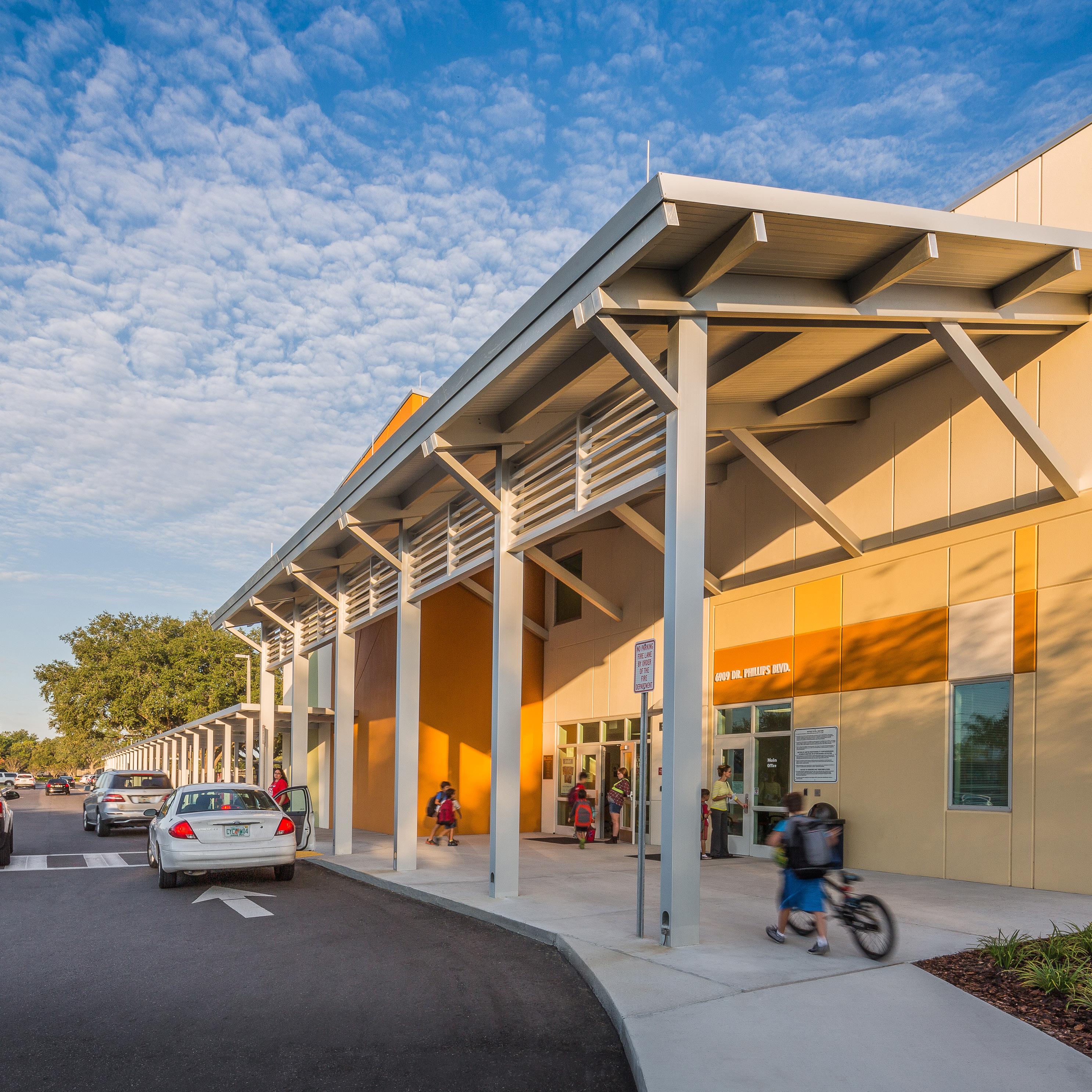 Located on a twelve-acre site across the street from a city park, the siting of the school announces the civic threshold of a public space. It is located off a major highway (SR 41) and is surrounded by water on three sides. Therefore, student and traffic safety were primary concerns. Accordingly, the building was set back from the road and drop-offs were sited across a canal so that entry is over a bridge. The school site also includes a large city park with two ball fields and a separate, full, regular elementary school playfield. The master plan included this state-of-the-art park, baseball and softball fields, picnic area, and volleyball courts.