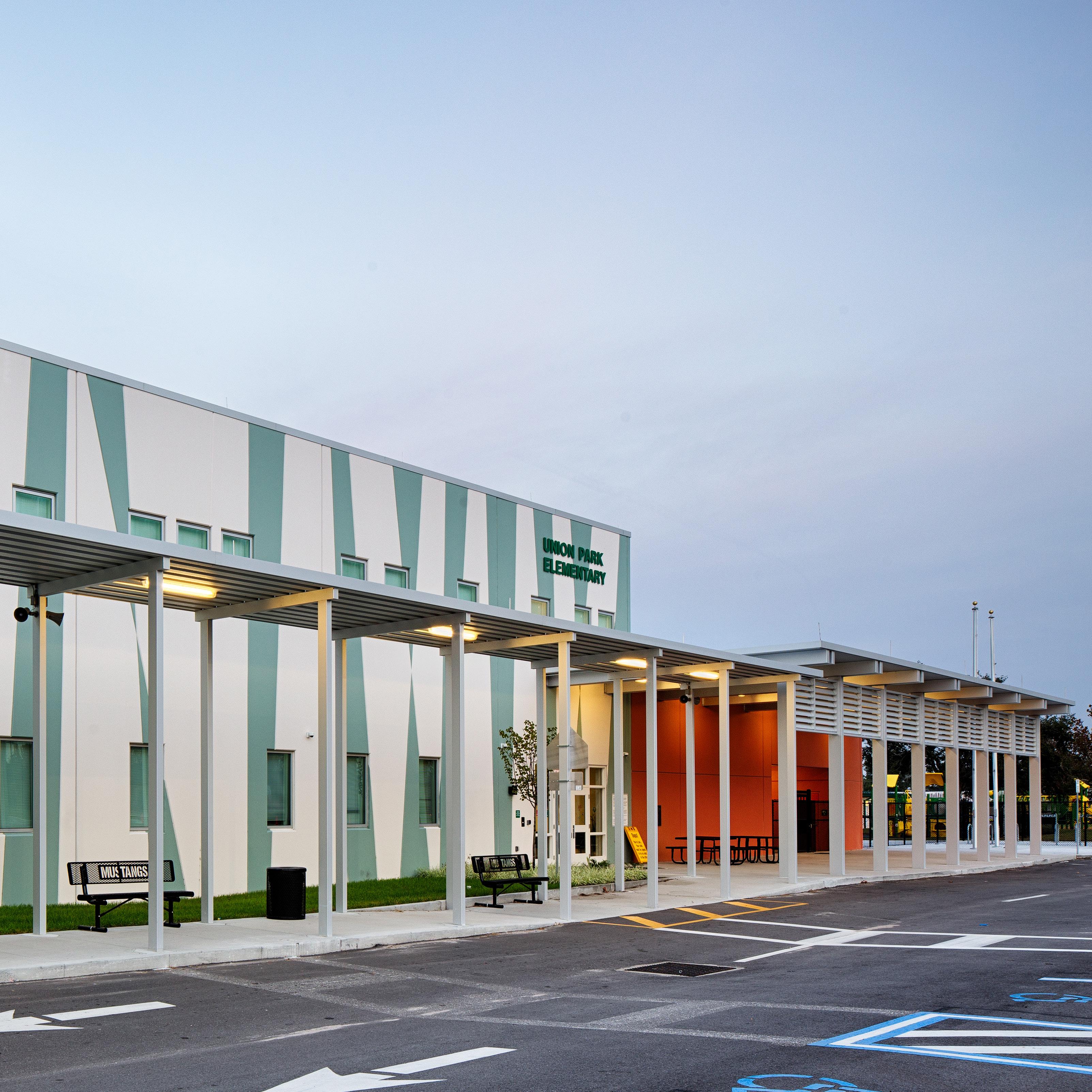 The new campus at Union Park Elementary consists of a new 79,000 SF, twostory building. The school includes 20 classrooms, an administration wing, a media center, kitchen, and dining multipurpose spaces, and a renovated 20,000 SF existing classroom building. The new facility design also includes art, science, and computer skills labs along with ESE classrooms and resource rooms. The renovated site design includes separate parent and bus entrances, new playfields, and a PE shelter.