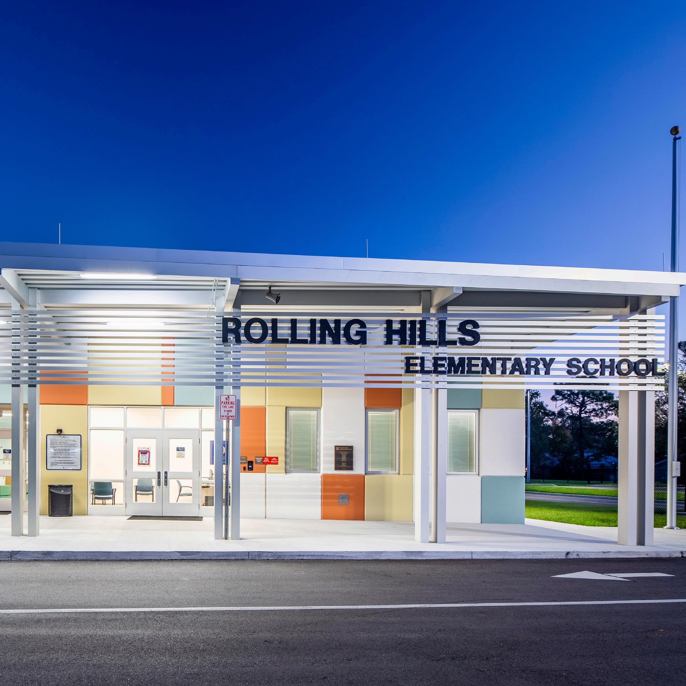 The Rolling Hills Elementary School was a replacement and renovation project planned in a single phase as students were being relocated to a swing school site during construction. The outdated, existing buildings were demolished, and the new school was built in its place. The new school campus includes 20 classrooms, an administration wing, a media center, kitchen, and dining/multipurpose spaces, and the renovation of two existing classroom buildings. The new facility design also includes art, science and computer skills labs along with ESE classrooms and resource rooms.