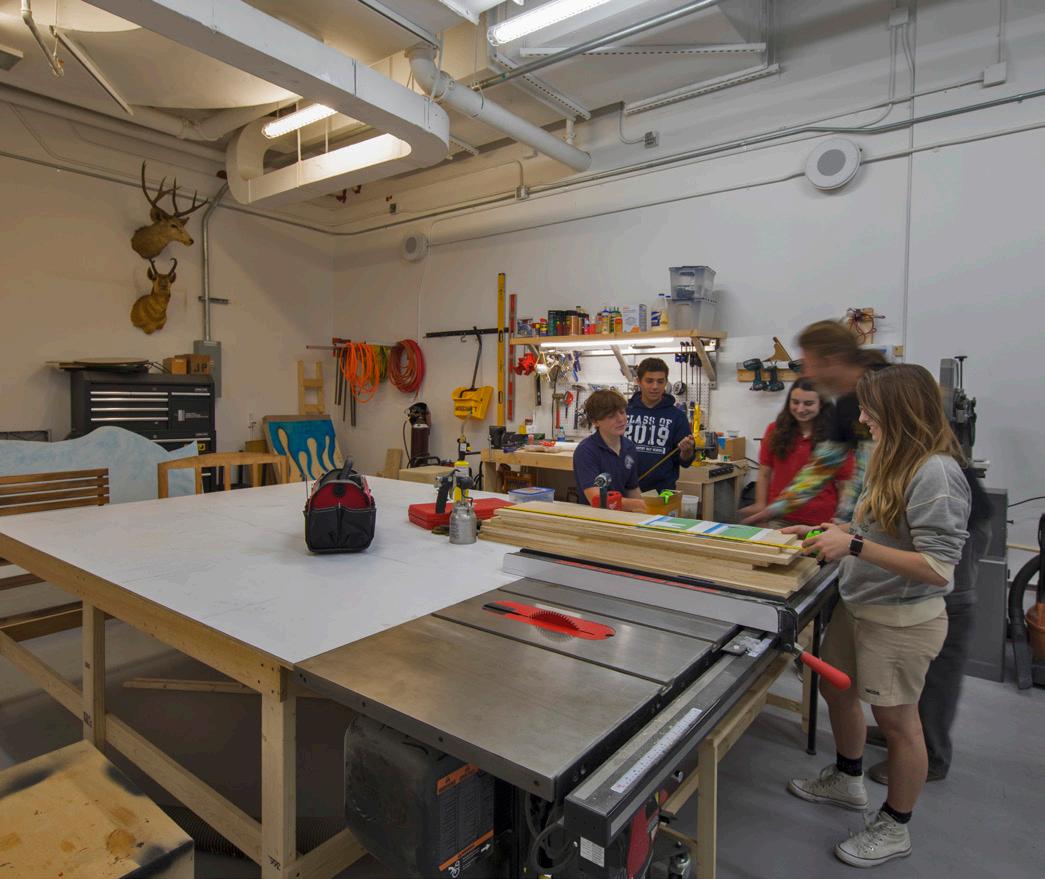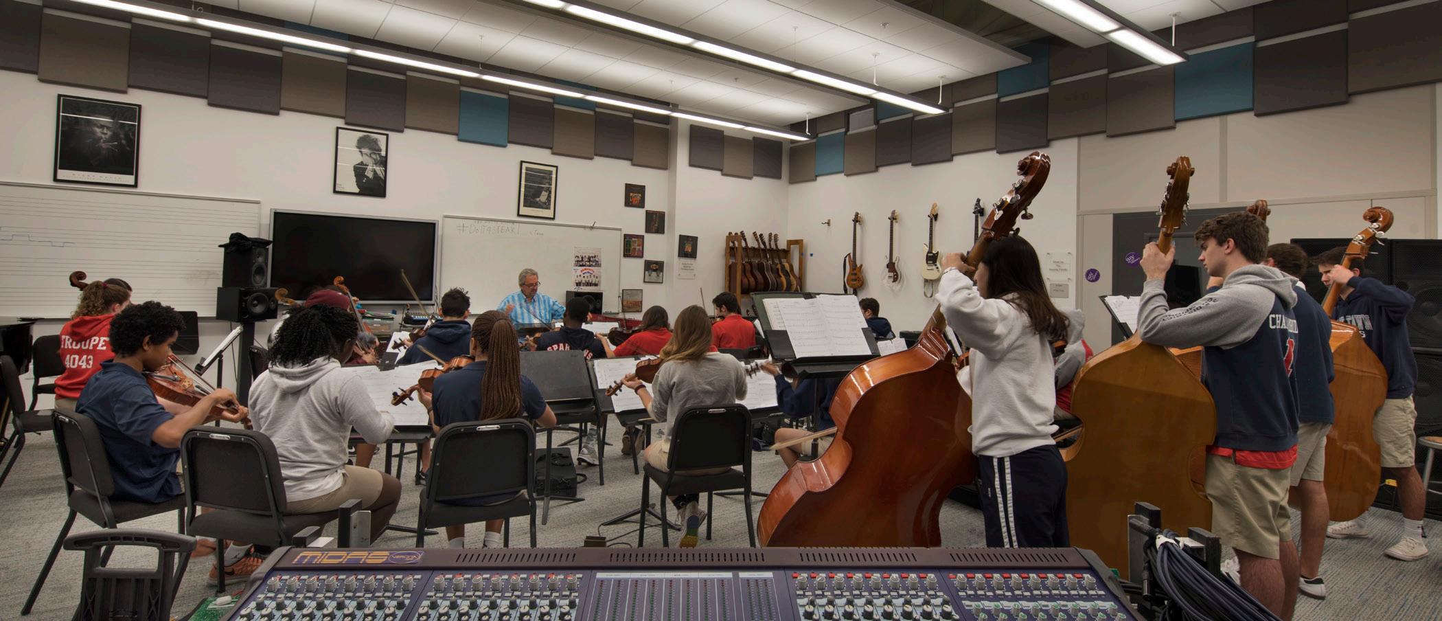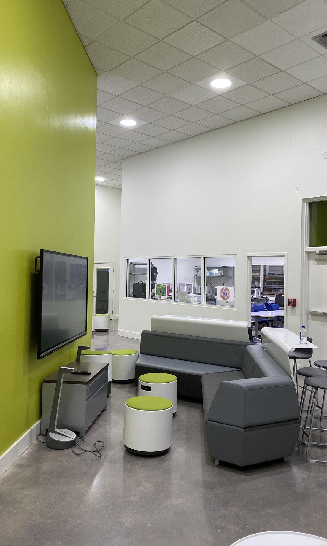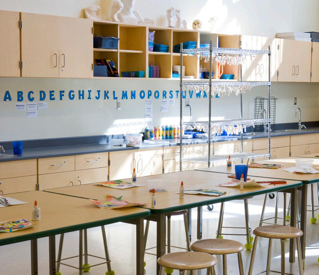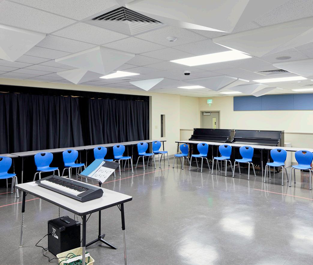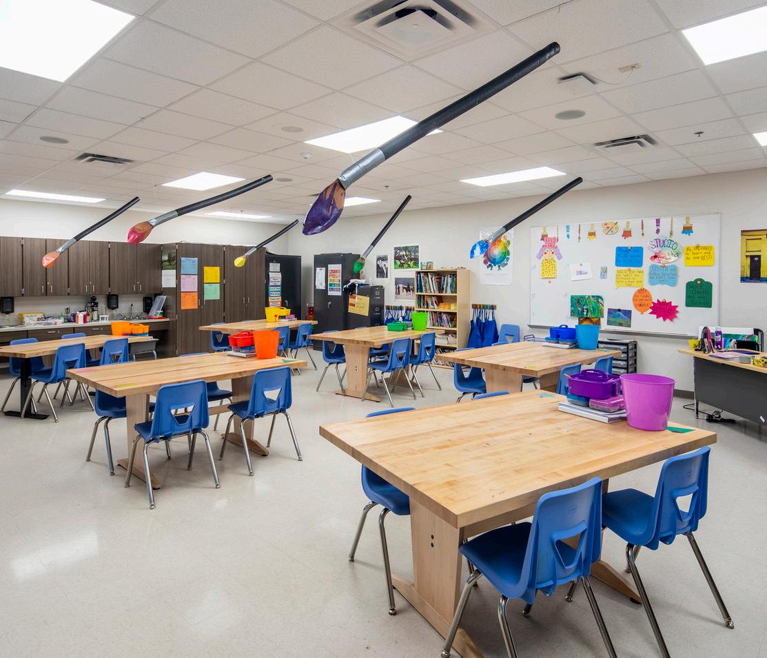 The new Center for the Arts provides the needed space for development of an already high achieving arts program for the campus. At the center and end of the art studio wing, on each of the two floors, the typical hallway expands to become an informal project-based learning center and gallery—one for art and one for performing arts/music. Students and teachers come together in these flexible environments that encourage interactive learning in ways beyond a typical classroom and lab environment.