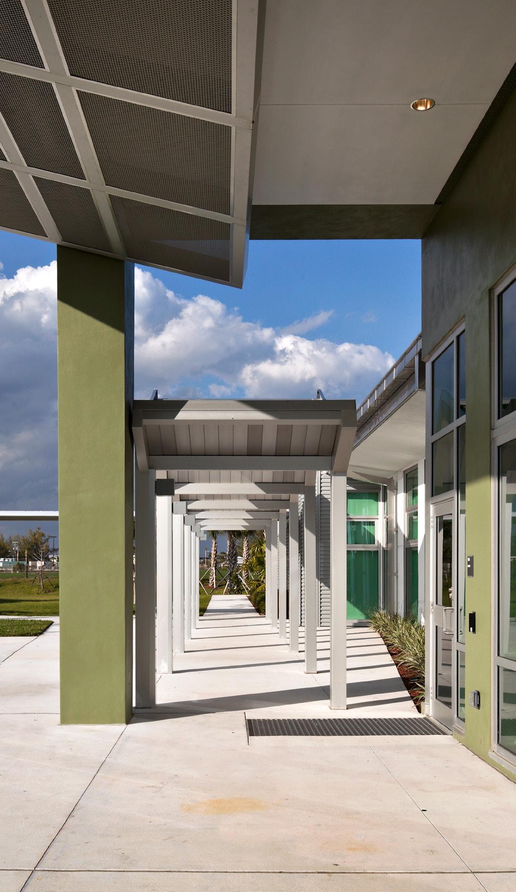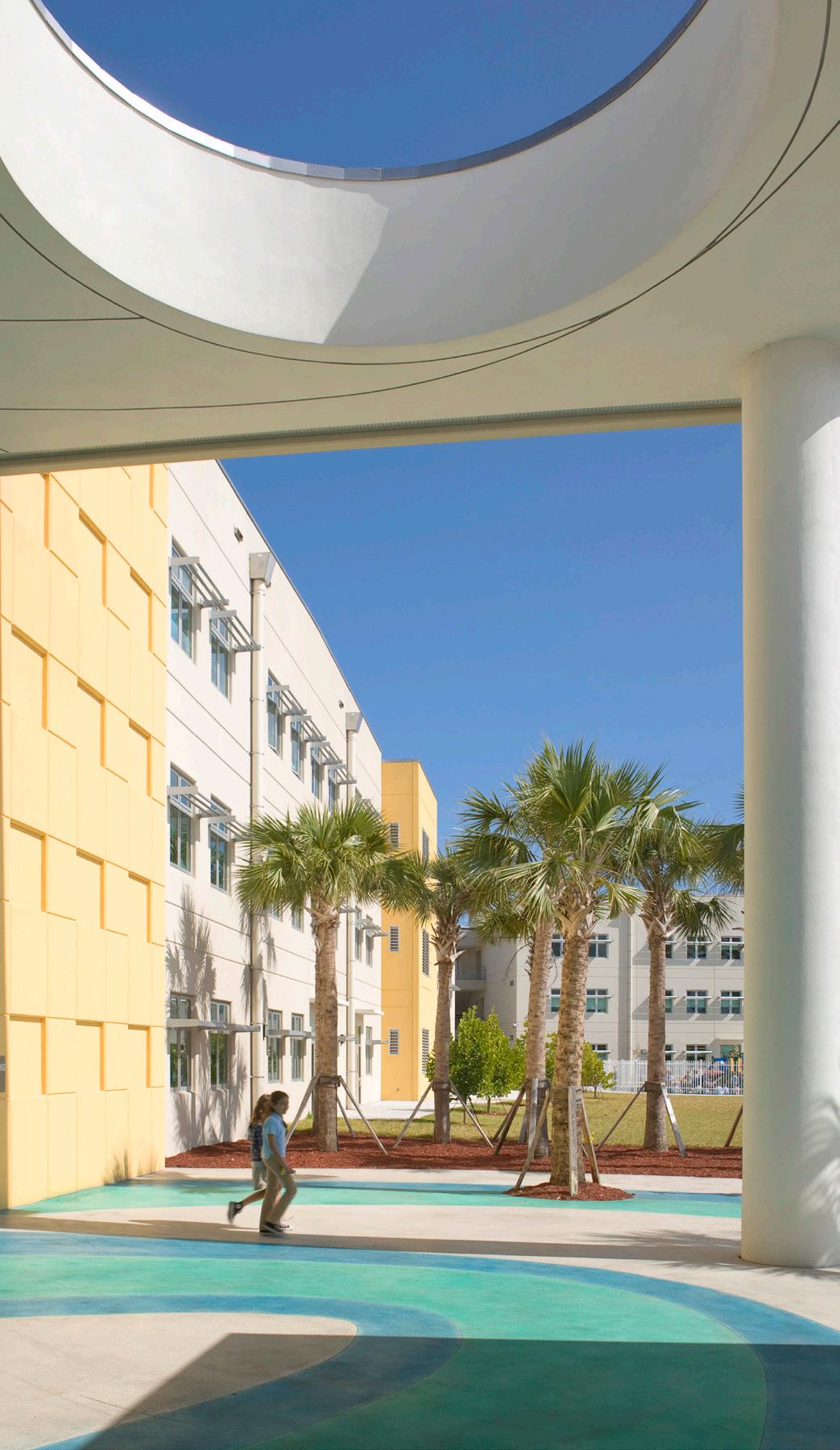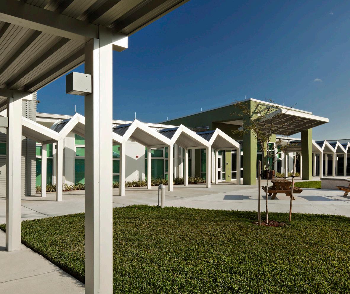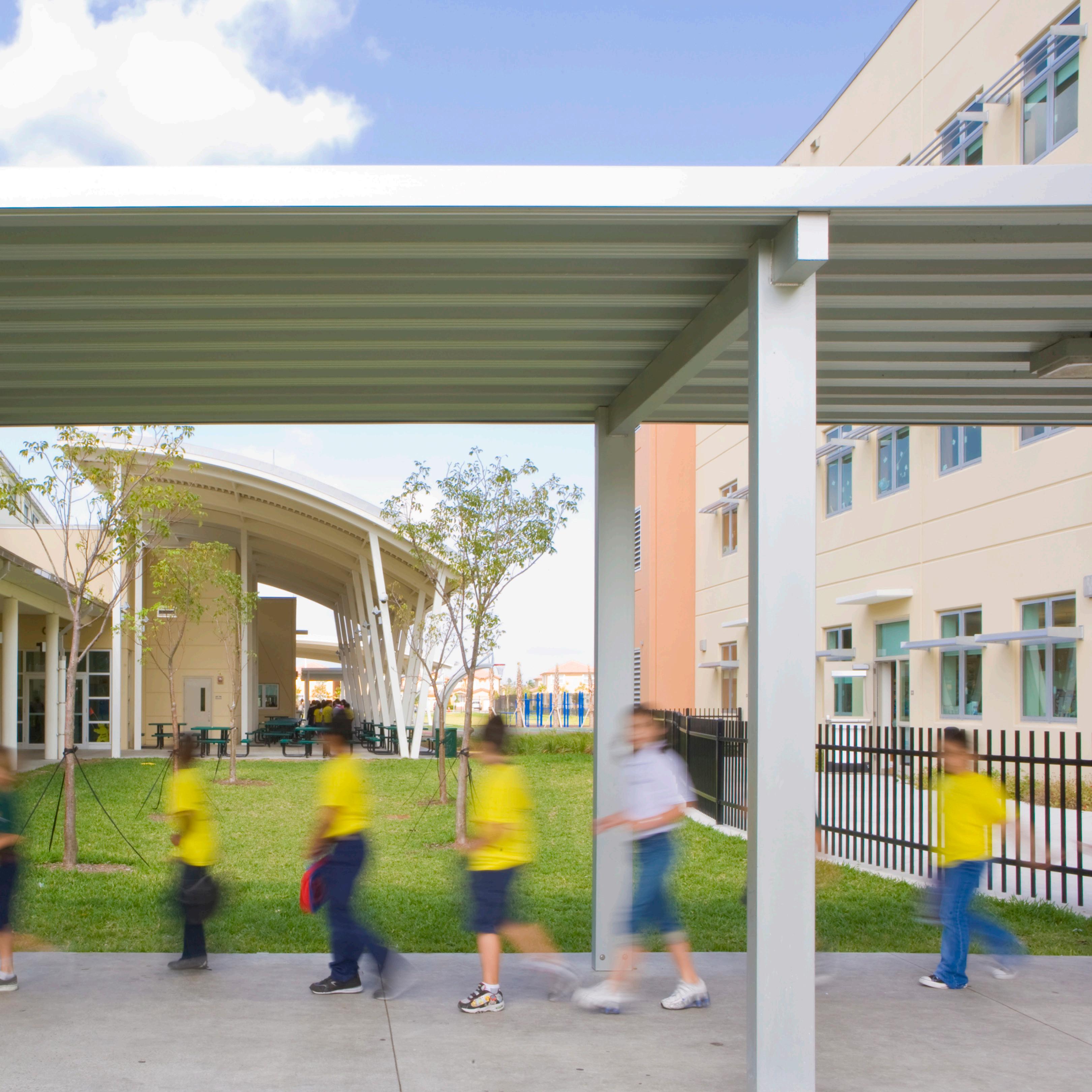 Arch Creek Elementary-Middle School is an adapted repeat of the original integrated Pre-K-8 facility designed for Miami-Dade County Public Schools. This school actually contains two separate facilities, an elementary and middle school, housed on the same campus. The schools are separated into two classroom wings, which are arranged in houses and are sprinkled with break-out collaboration areas, project rooms, wet areas and story-telling alcoves.