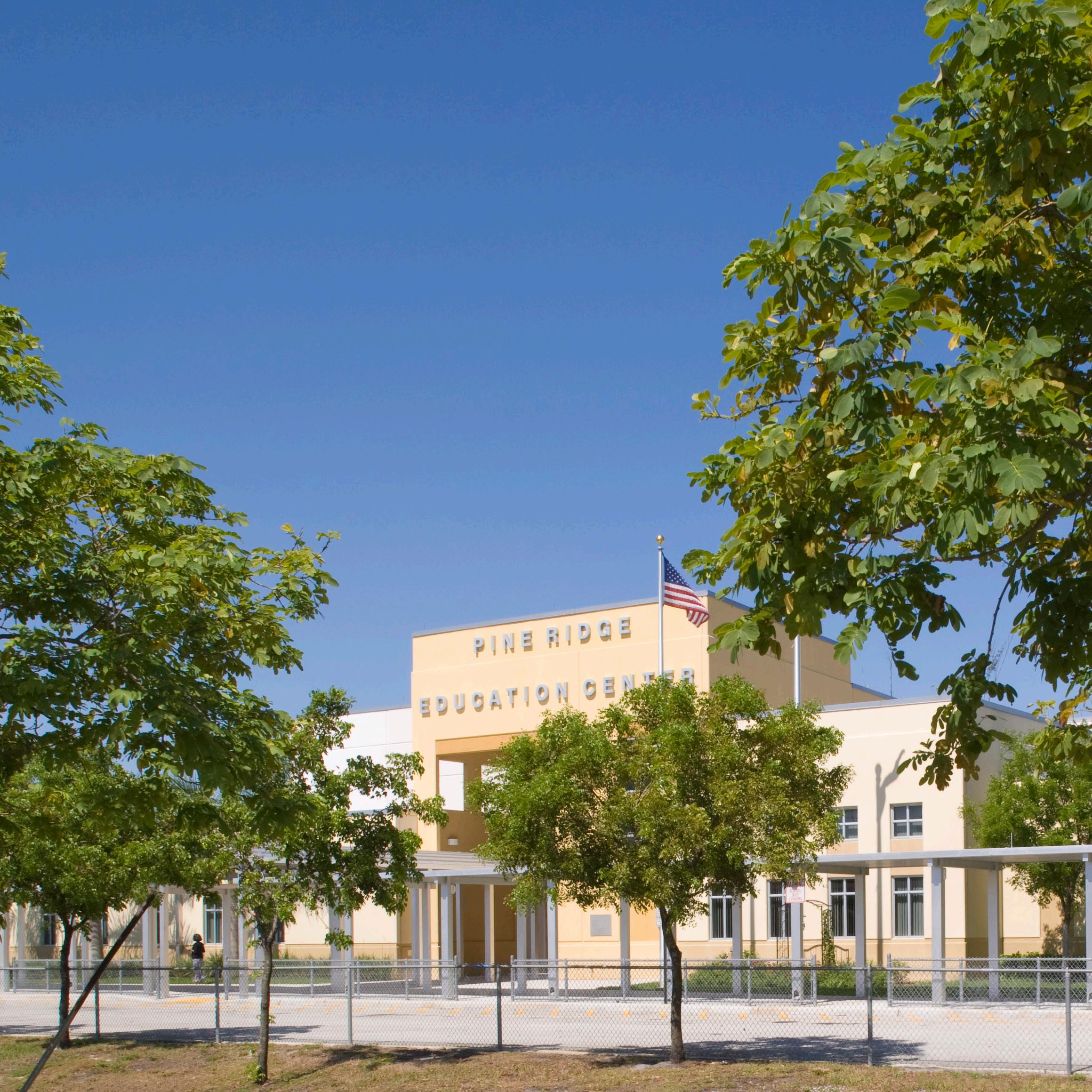 Pine Ridge Education Center is an education and life skills training facility for troubled youths. The look and feel of the replacement school is one of optimism and progression while the building design reinforces order, discipline and control. The school incorporates facilities for grade levels K-12, each meeting the needs of their specific educational goals while providing a place of safety, security and behavior management through integrated site and building design.