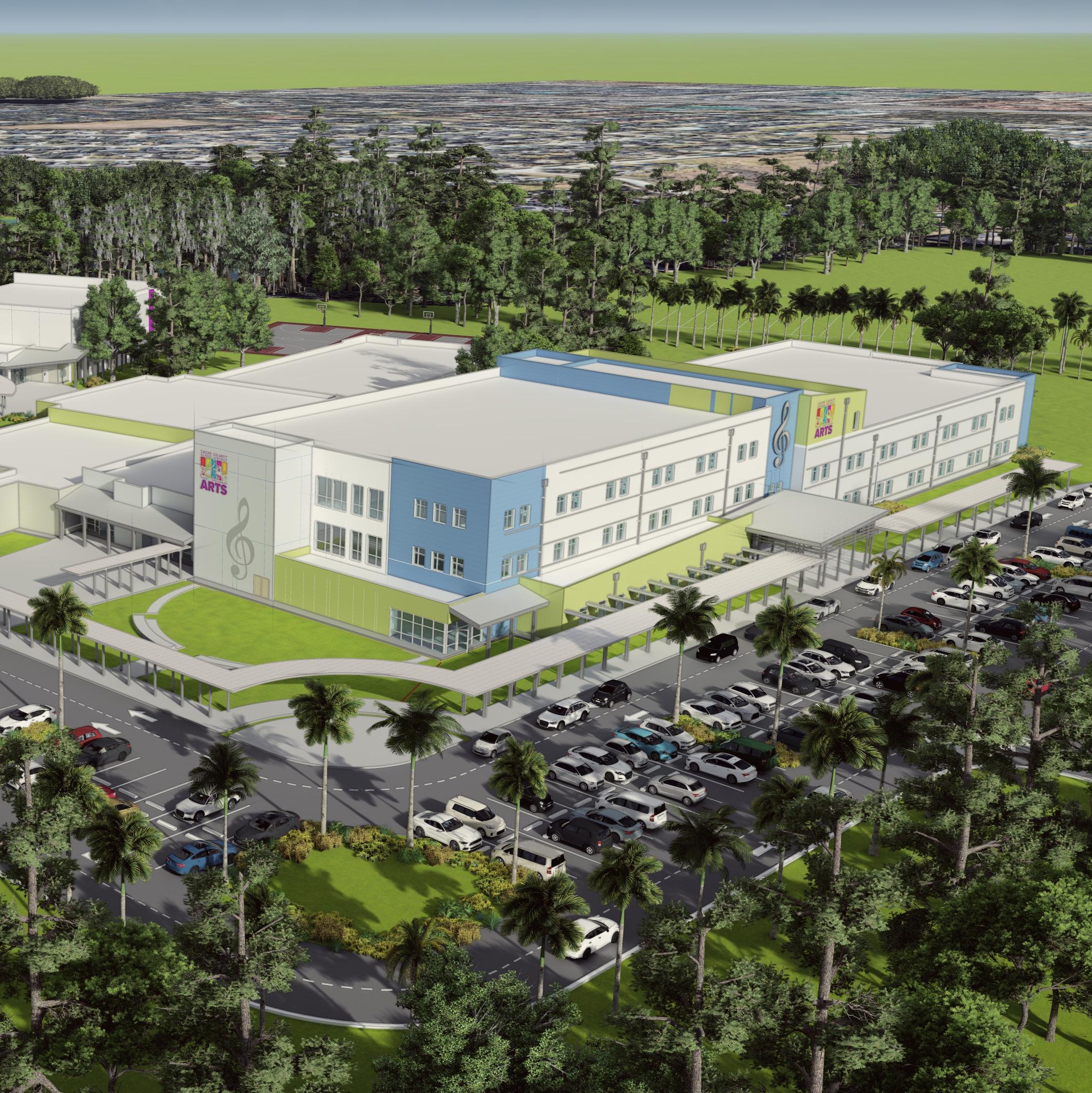 Minneola K-8 “FF“ is a reuse of Stratus’s K-8 prototype, a compact three-story 169,000 SF K-8 school currently being customized to Lake County School District needs. The design includes related master planning work beyond site adaption to create a comprehensive and integrated new school campus. The campus master plan includes parent and bus dropoffs, play fields, track, and other site improvements. The auditorium will support the new school’s performing arts and curriculum programs as well as after-school community theatre and events.