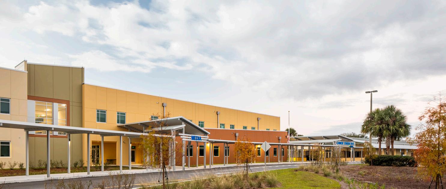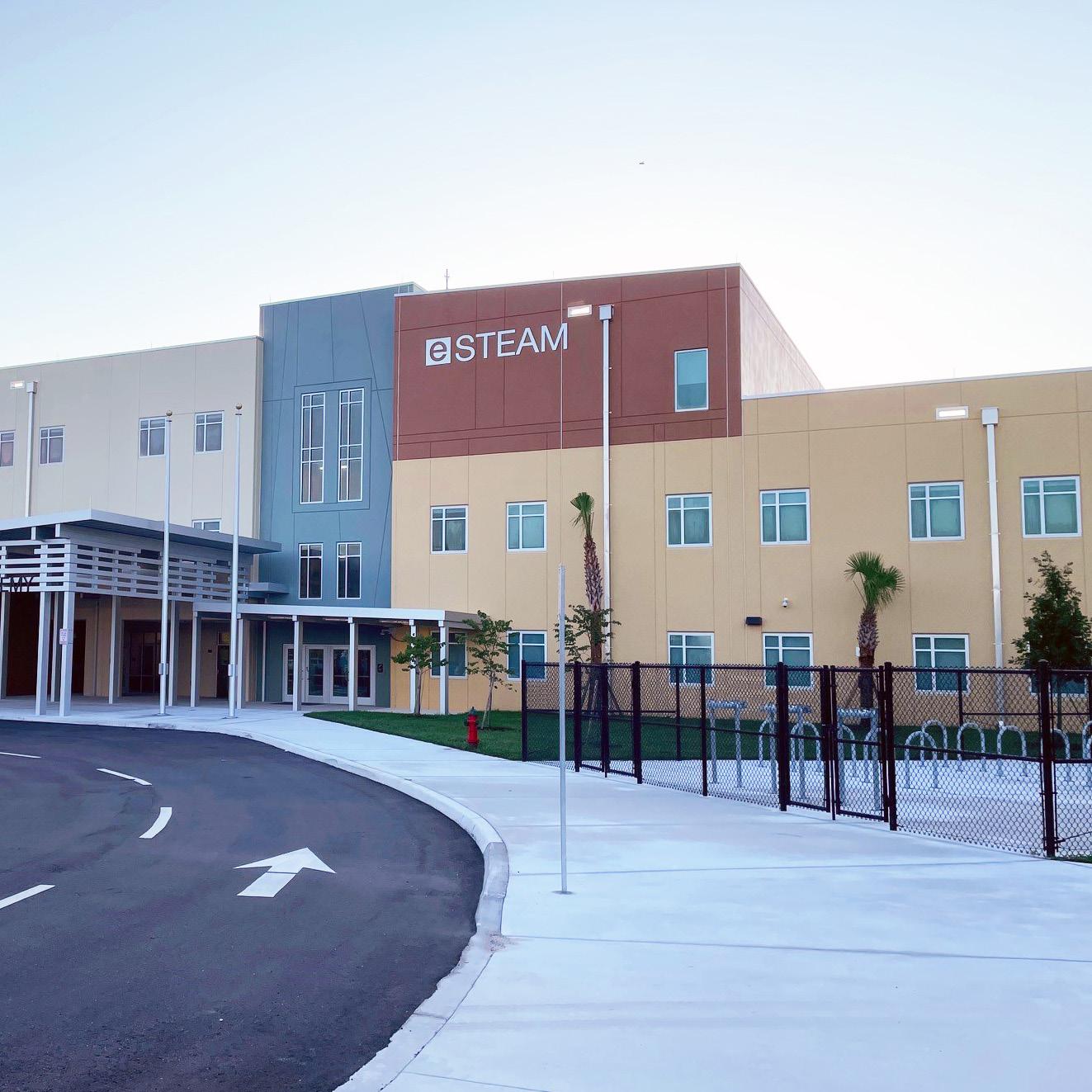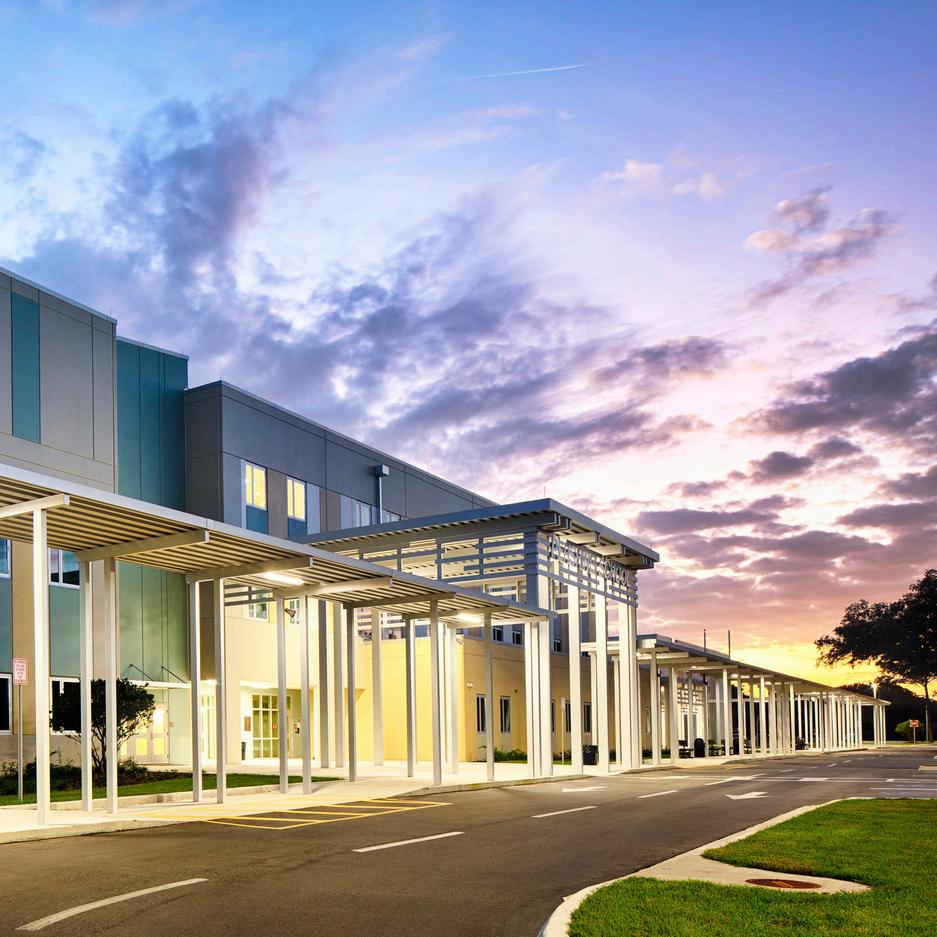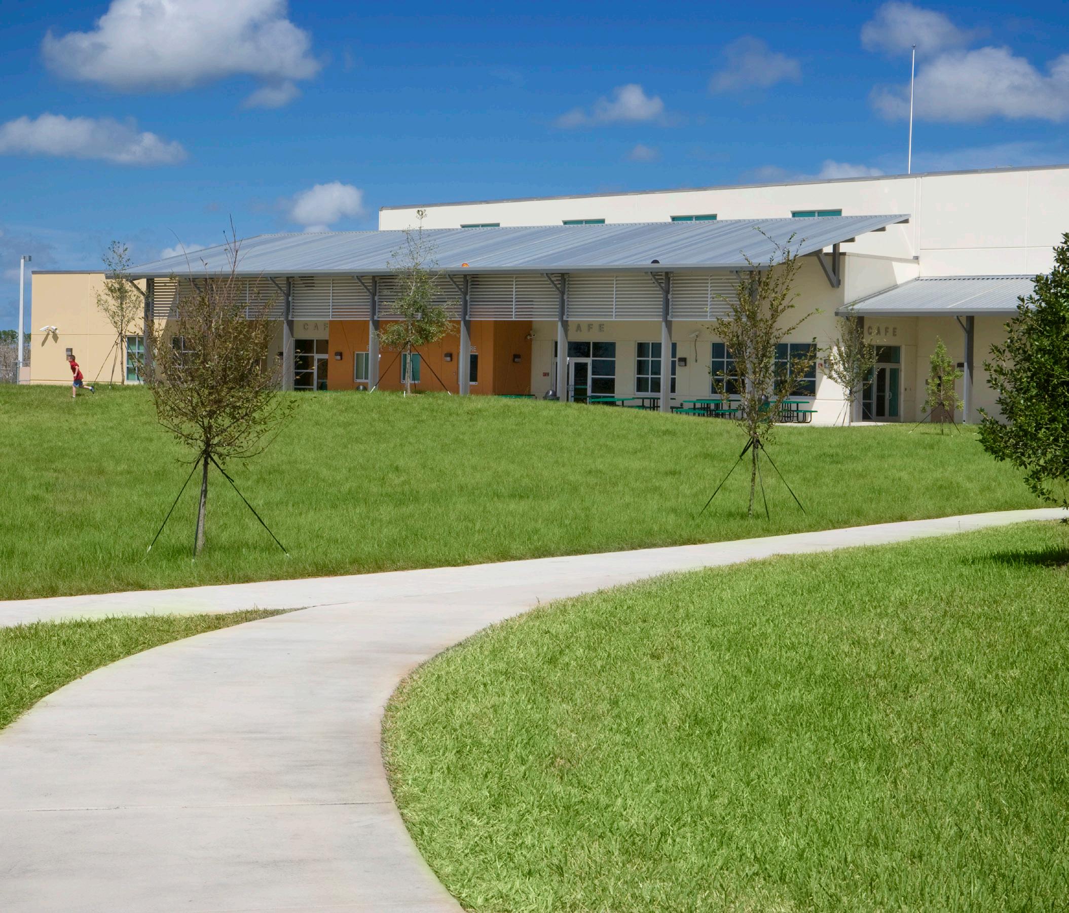 This new school is the first E-STEAM public school in the state of Florida where the kindergarten through 8th grade curriculum focuses on science, technology, engineering, and mathematics with an environmental emphasis. The school is located in Lake County on a 40-acres sloping site with a beautiful variety of Florida’s natural ecology, which is integrated within the curriculum and building design. The compact three-story building is a 21st century learning environment with the new building’s core spaces featuring a state-of-the-art STEAM lab for all grades and skill career labs for culinary arts and media. This site provides for separate student & bus drop-off along with extensive queuing of vehicles onsite to minimize school traffic in the community.