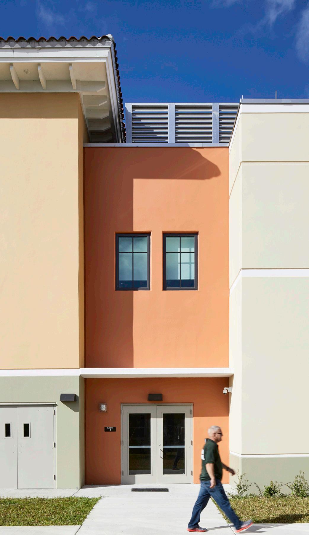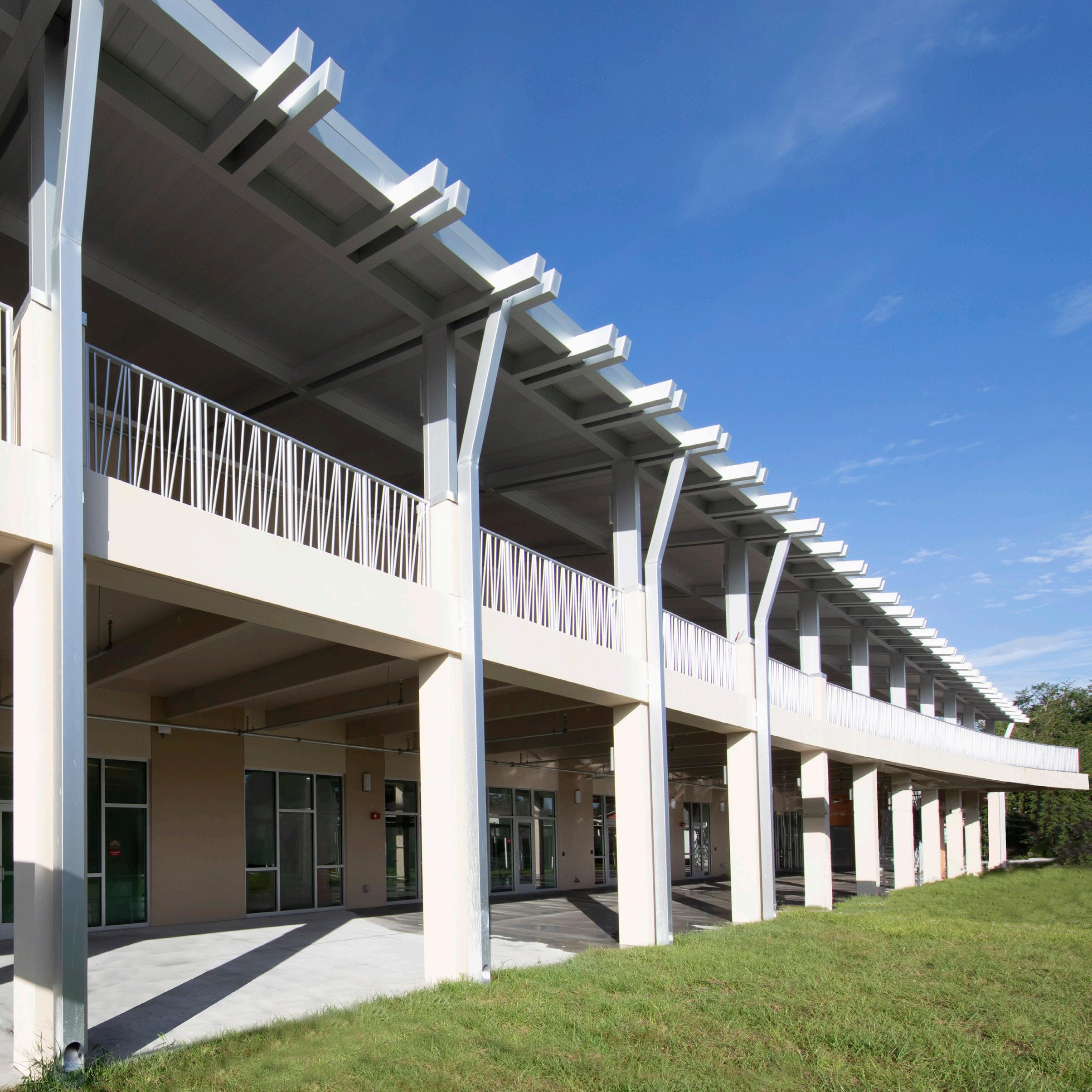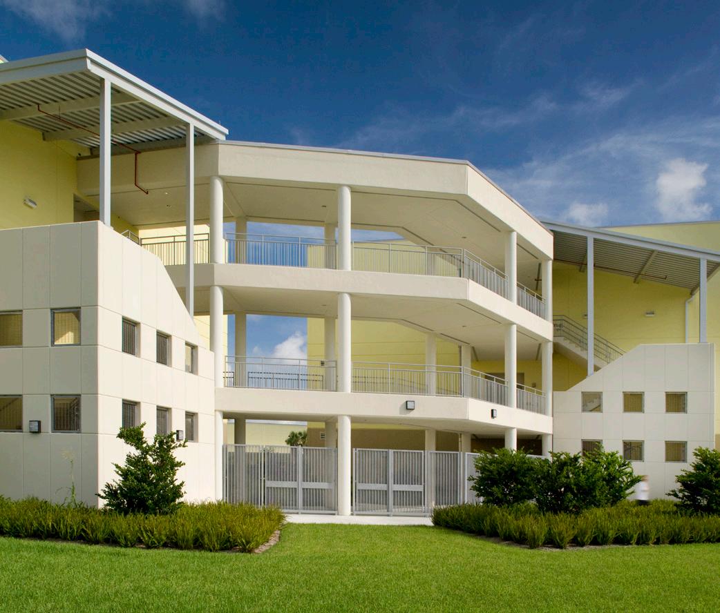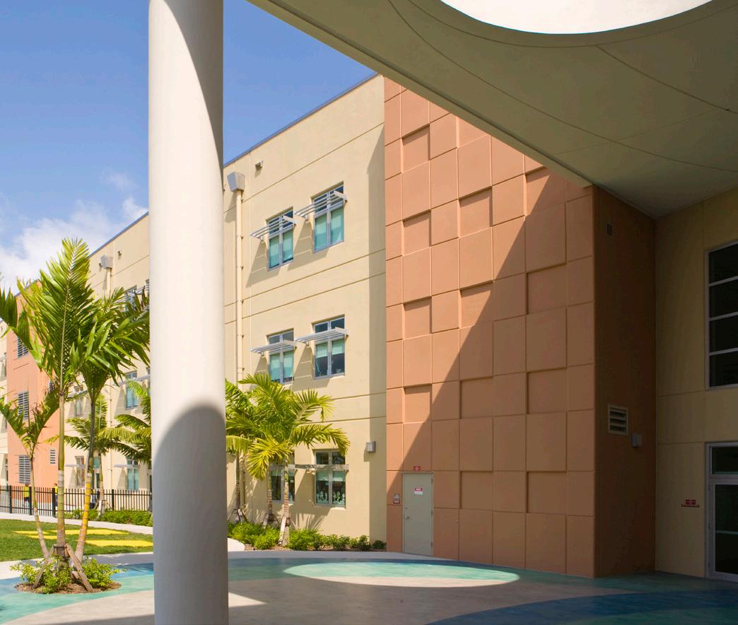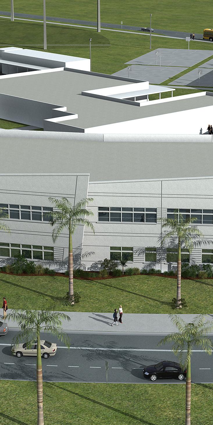 Stratus Architects recently completed a new generation of 21st Century urban prototype K-8 schools for the Miami-Dade County Public School system. The design delivers a school comprised of a series of “proto-parts:” modular classroom buildings, a Fine Arts/Dining assembly building, an Administration/Media building and a P.E. building/shelter linked by “connectors” containing staircases, mechanical rooms, toilets and other support spaces. A variety of connector modules is provided creating classroom buildings which can respond to varying site conditions and configurations.