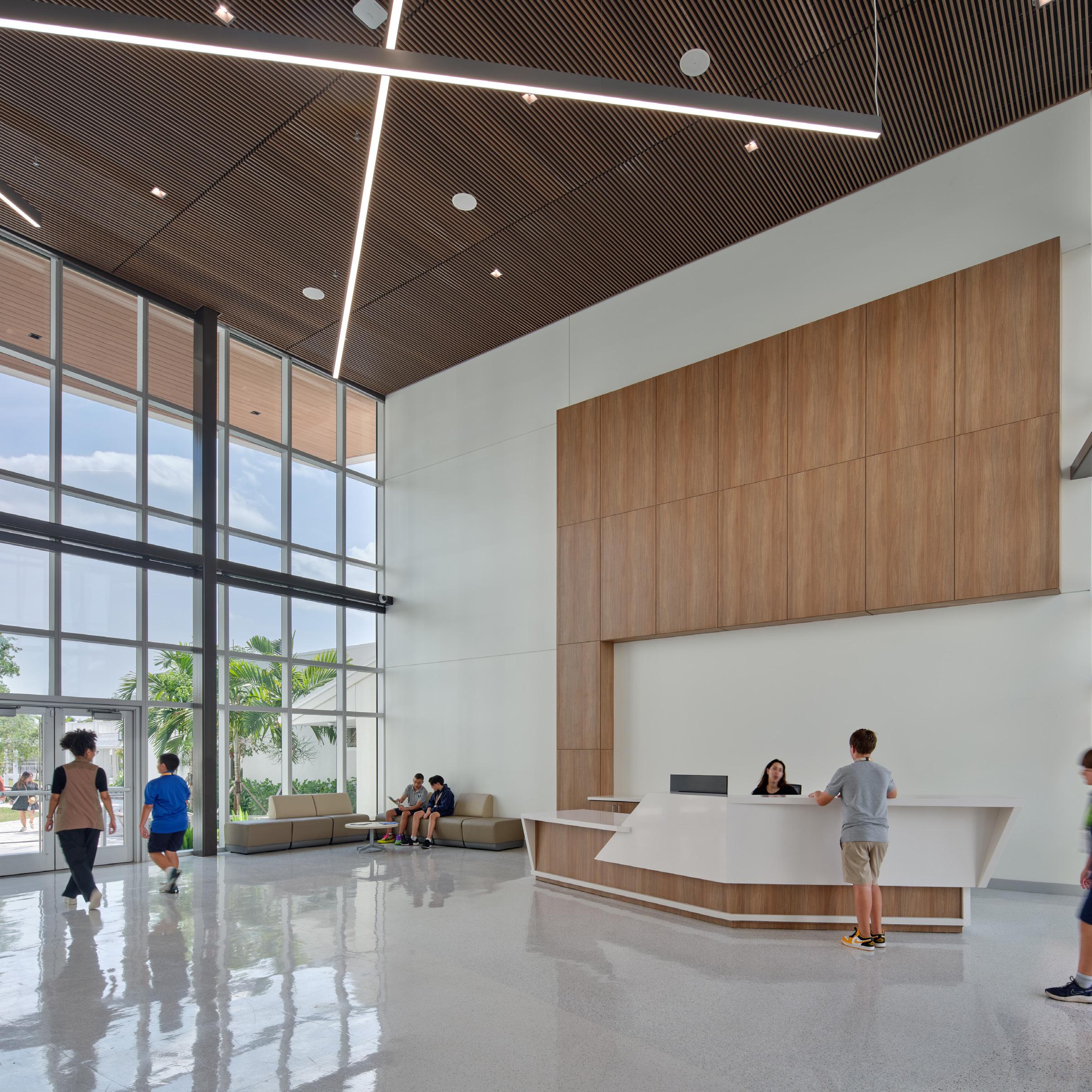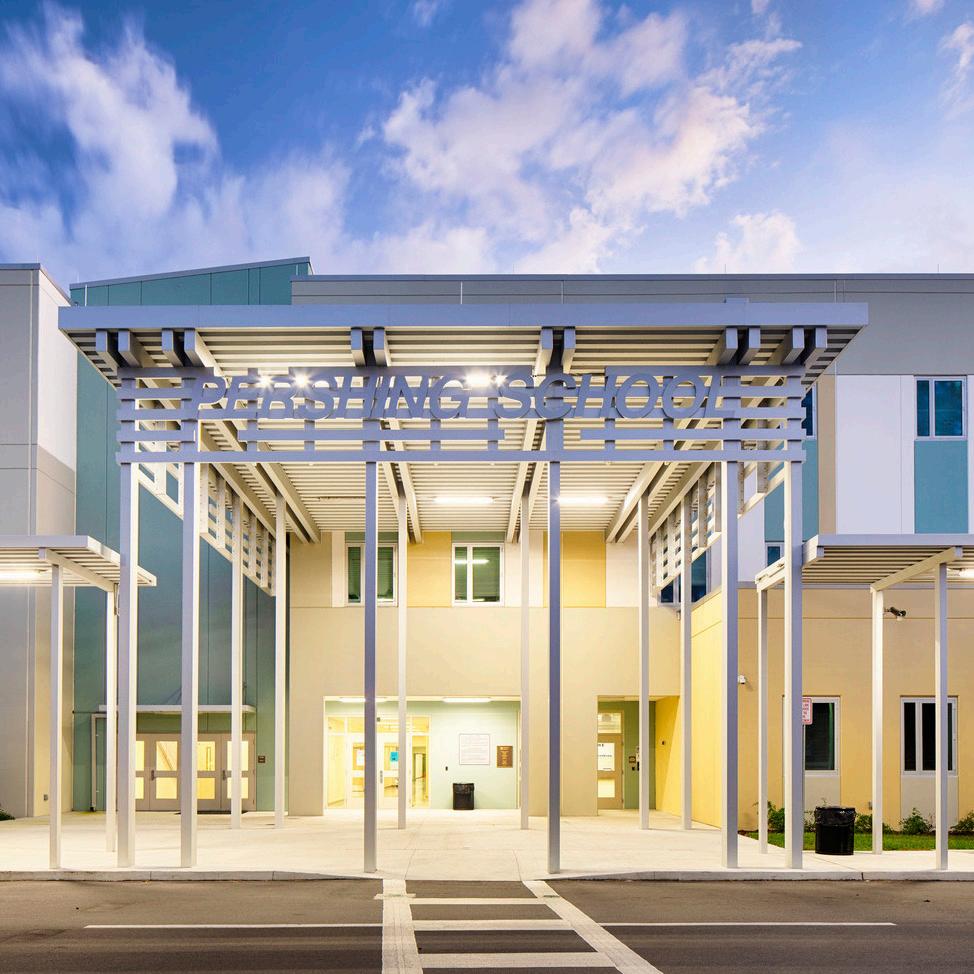The bright, sustainable, collaborative and expandable Pershing K-8 School replaced two aging ones—Pine Castle and Pershing Elementary School—and merged student populations into one learning environment with flexible instructional spaces that promote interdisciplinary teaching, collaboration, and development.