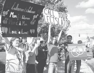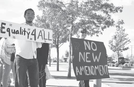 Individuals, couples and clusters of gay men and women were joined by othersinsupportofmarriageequalityforsame-sexcouplesatarallyoutside theSpokaneArenaOct.10.Therallycountereda Mayday for Marriage prayerineventsponsoredbysomeareachurchesandquasi-religiousorganizations. Intheforegroundabove,amongthenearly100demonstratorsalongHoward Street leading to the Arena entrance, were, from
