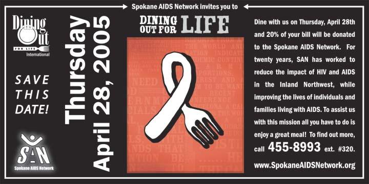 Ten restaurants had signed on to participate with SAN as Stonewall News went to press. The list will grow, but already offers a surprising variety in cuisine as well as cost alternatives. The list will be updated on SAN’s Web site at: www.spokaneaidsnetwork.org. Or, for questions, call SAN at 455-8993, ext. 320.