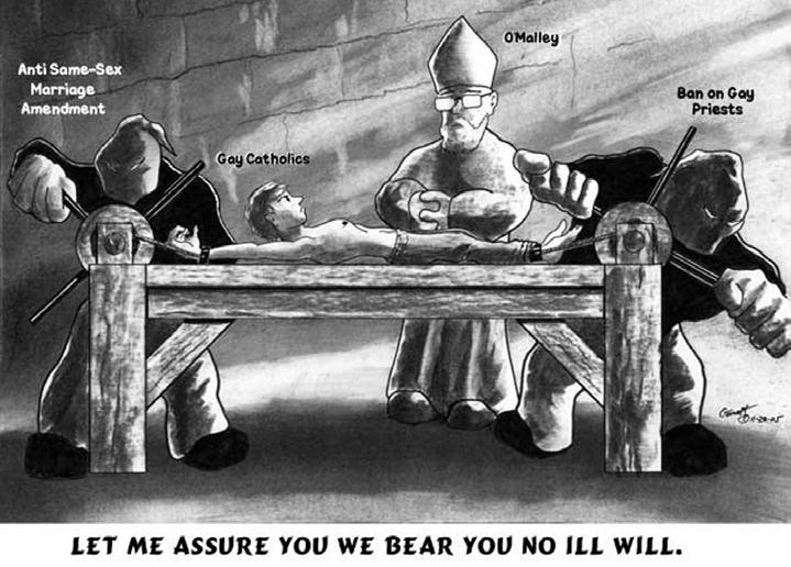 In the letter, O’Malley said that he doesn’t want gays to feel like the church discriminates against them. He says he wants gays to know that the church has no hostility toward them. And if you’re wondering by now what kind of incense the Archbishop is smoking these days, you need to bear in mind that his words aren’t directed at the gay people sitting in the pews, but the heterosexuals who might at this point be getting a little uncomfortable with what is happening. O’Malley’s statement is meant to reassure them, not the gay Catholics sitting next to them. It’s the kind of calming patter people utter to each other while they’re busy kicking their neighbors in the teeth...the sound of people reassuring each other that the heartless bigot they see in the bathroom mirror every morning isn’t really them.