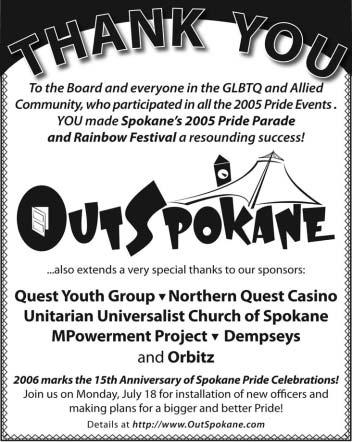 Community members inspired by this year’s successes are invited to attend a general board meeting Monday, July 18, at 827 N. Madelia St. in Spokane (next to Northern Exposures Photography Studio). The 2006 OutSpokane Pride Committee will be Continued on page 17