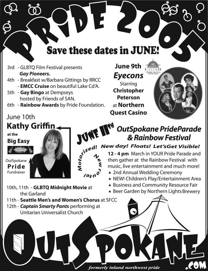 OutSpokane (the Pride Day committee) meets tonight and every Monday until Pride Day at 6:30 at the OutSpokane Center, 817 S Madelia St.
