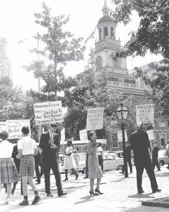 The first public rally for gay rights –40 years ago at Independence Hall in Philadelphia – is the subject of next month’s Pride Week movie, Gay Pioneers Note that protest organizers required women demonstrators to wear skirts and the men to wear shirts and ties. Among the courageous participants, Barbara Gittings, foreground and inset, will be the featured celebrity guest at the opening event for Pride Week at the EWU Riverpoint Auditorium on June 3, courtesy the Spokane Gay and Lesbian Film Festival committee. scene from Gay Pioneers