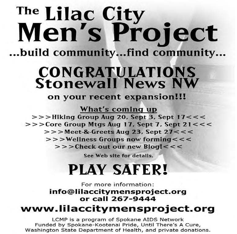 The RRCC will hold a Surplus Sale on Saturday August 26, 9 a.m. to 3 p.m., and Sunday August 27, Noon to 5 p.m. at the 508 W. 2nd Ave. location to sell surplus inventory and duplicates. Items such as non-GLBTQ videos and books, surplus furniture, and other items will be sold to the public. The Rainbow Store will also be open during these hours with specials and discounted items. Non-profit organizations, with a preference given to queer non-profit organizations, will have an opportunity to pick from designated surplus items on a first-come-first-served basis on Friday, August 25 from 3 p.m. to 8 p.m. For more information, contact the RRCC at 489-1914 or e-mail info@ spokanerainbowcenter.org.