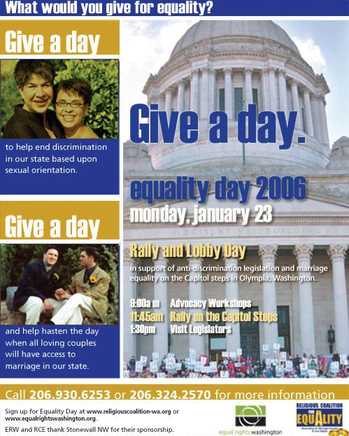 Toward this end, and to educate about of other equality-oriented issues, including marriage, Equality Day has been set for Monday, Jan. 23, in Olympia. ERW and the Religious Coalition for Equality will be cosponsoring the multipart event along with other groups and individuals. (For sponsorship options, go to www. equalityday.org.)