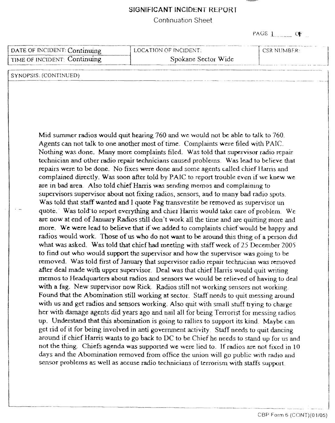 Then in late January Sturchio noticed “Git R Dunn” written on the back of one of the trucks at the CBP shop in Spokane. A few days later “I (heart symbol) Brokeback” was written on the back the agency truck. Sturchio complained to her supervisor and the graffiti was removed. Then on Sunday January 30th Sturchio found Significant Incident Report (SIR) Fax that had been sent from the Spokane Border Protection office to union offices as well as Sturchio’s office across town. The fax contained appalling derogatory remarks such as “Fag Transvestite removed as supervisor,” “Abomination still working at sector,” and indicated that Sturchio caused technical problems on the job and should be charged as a terrorist. The fax goes on to state that “understand this abomination is going to rallies to support its kind. Maybe can get rid of it for being involved in anti-government activity.” Sturchio now believes that “Git R Dunn” was a reference to wanting her fired and the fax was written by someone who was “under the impression I was to be totally removed, and I wasn’t.”