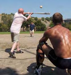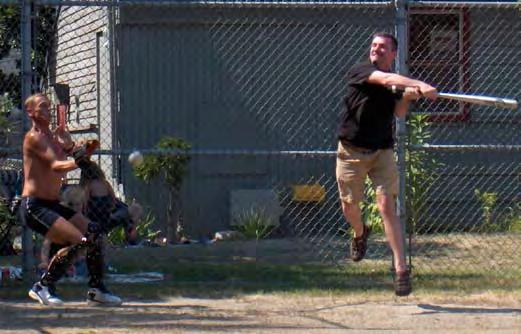 Lunging into the air, Leonard Jenkins (right), swings his bat with unbridled determination. Dennis Davis (left) serves as catcher during the game.