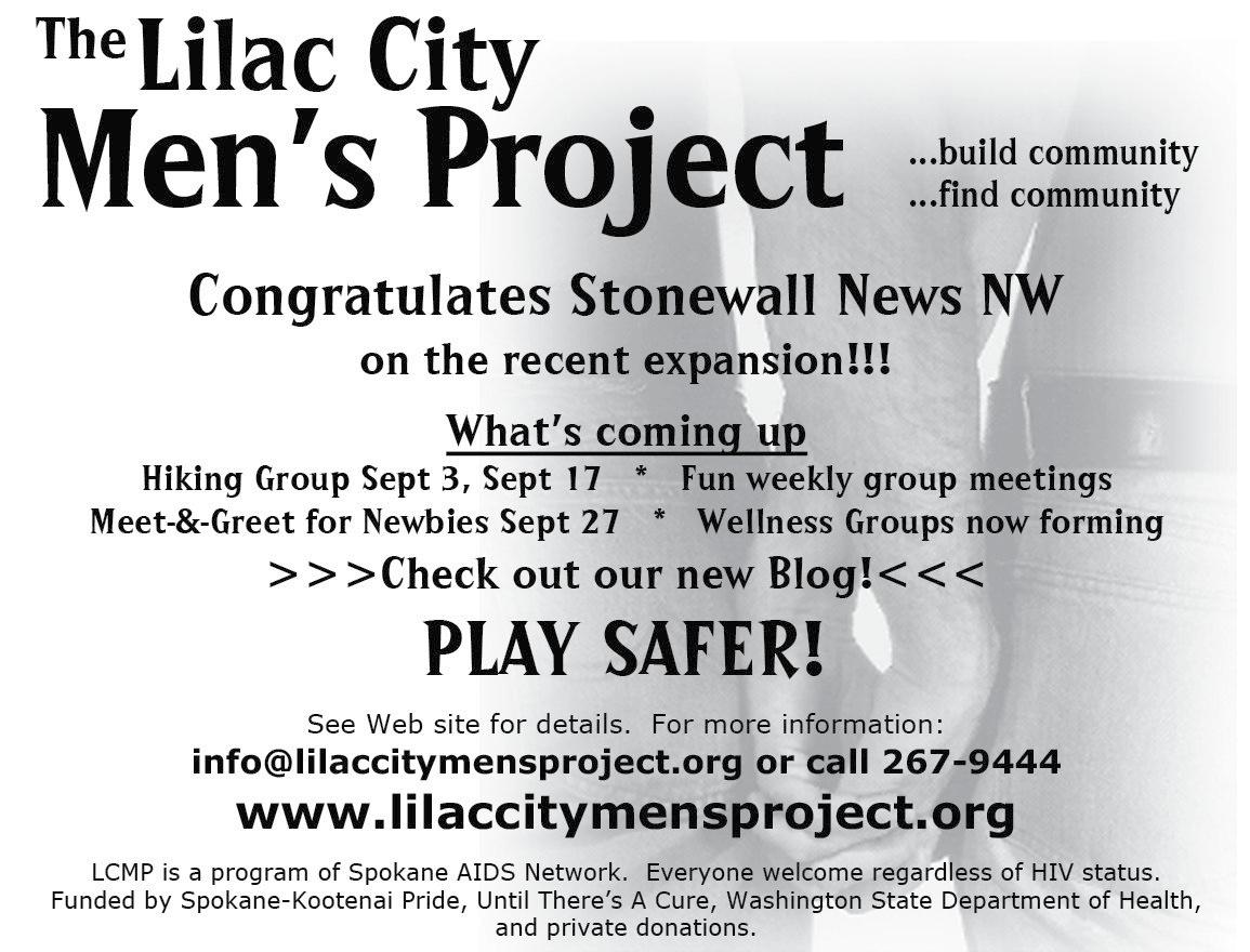 6:00 pm–7:30 pm LCMP Planning (at SAN) “Core Group” meeting of the Lilac City Men’s Project. At these meetings we plan, strategize and talk about upcoming events, bar zaps, and wellness groups, and how we can collaborate with other GLBTQ organizations to put on events and present wellness groups. New guys are always welcome at these meetings, but they are PLANNING meetings, so come prepared to give your input! SAN is located at the corner of 9th and S. Monroe, in the big blue house across the street from Huckleberrys!