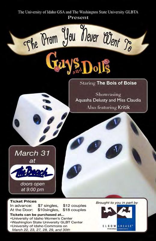 7:30 pm – 8:30 pm [Moscow, ID] The Prom You Never Went To (at The Beach)This is an event sponsored by the U of Idaho GSA and the WSU GLBTA. It is a kick ass dance that everyone should come to even if they do not attend these two schools. It is starring the Bois of Boise, Miss Claudia, Aquasha, and featuring Krikit. This event is intended to be an event that allows and embraces diverse populations. It originated from the thought that many GLBTQ youth were not welcome or comfortable enough to attend their own high schools’ prom. With an inclusive prom event like our Prom You Never Went To, all people are welcome to attend in their formals or other attire, in drag or tow, whichever is desired. Tickets are $7 for singles and $12 for couples during presale. $10 singles and $18 couples at the door.