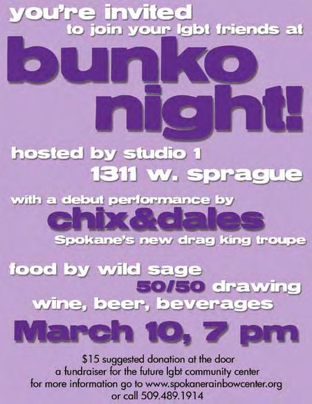 7:00 pm – 10:00 pm Gay Bunko! (at Studio 1, 1311 W Sprague) Come play Bunko with your GLBT friends and support the future LGBT Community Center at the same time! Dana and DeVerne of Studio 1 host this fun event that is sure to become a Spokane staple! Featuring an appearance by Spokane’s new Drag King troupe, Chicks and Dales! Food provided by Wild Sage, 50/50 drawing, and wine/beer available for purchase.
