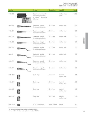 The instruments and depth stops are also available individually. * Includes SCS occlusal screw. For replacements order 048.350V4