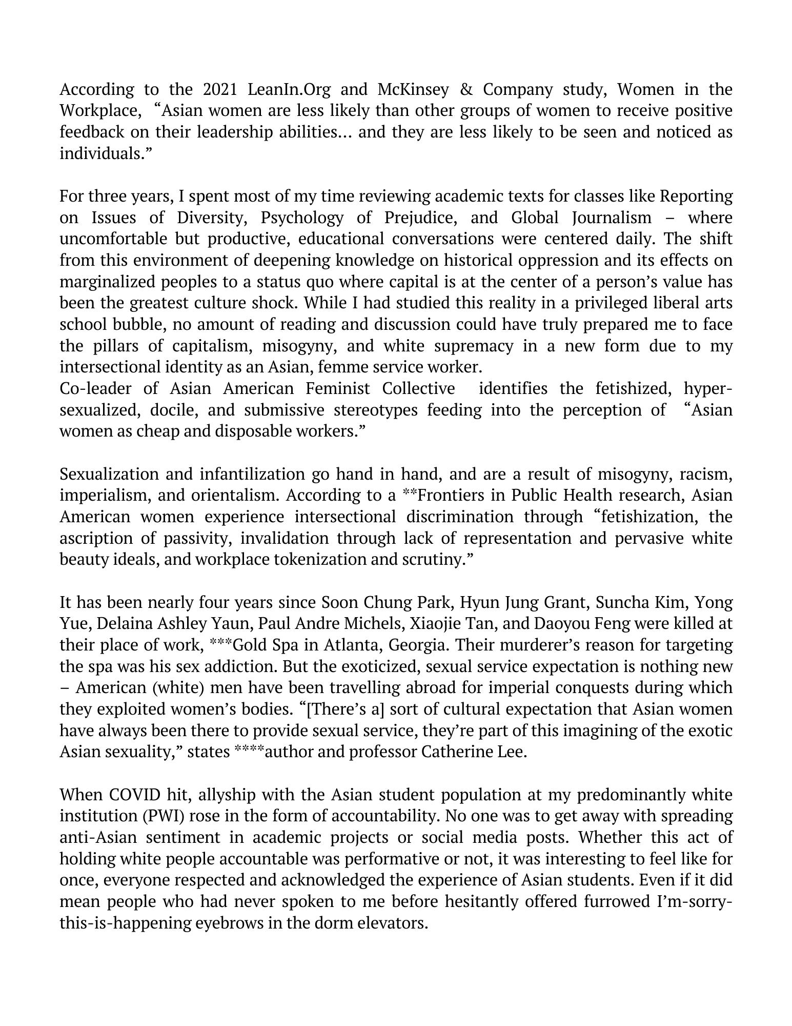 * https://www.cnn.com/2021/03/17/us/asian-women-misogyny-spa-shootings-trnd/index.html ** https://www.frontiersin.org/journals/public-health/articles/10.3389/fpubh.2023.993396/full *** https://www.theguardian.com/us-news/2022/mar/16/anti-asian-racism-atlanta-spa-shootings-anniversary **** https://19thnews.org/2021/03/legacy-us-policy-violence-against-asian-american-women/