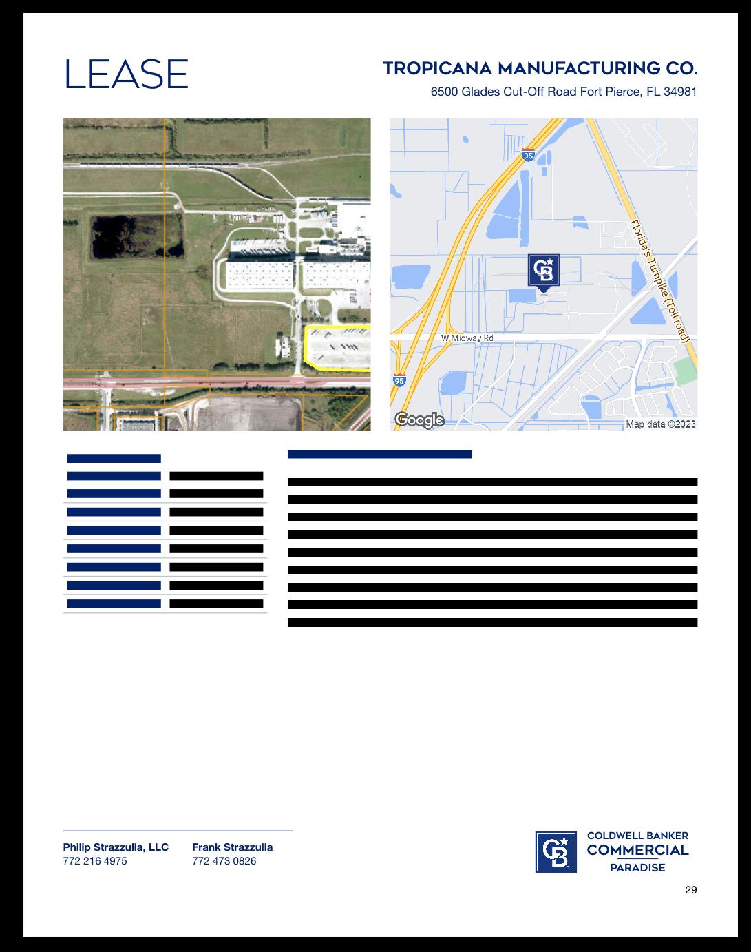 Philip Strazzulla, LLC 772 216 4975 Frank Strazzulla 772 473 0826 Coldwell Banker Commercial Paradise 16 Lease Tropicana Manufacturing Co. 6500 Glades Cut-Off Road Fort Pierce, FL 34981