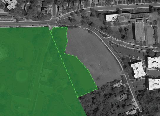 This development will transfer approximately 40% (1.8 acres) of the lower lot to the park. In addition, the developer will contribute over $80,000 worth of new equipment to the park. The aerial view highlights the additional park space.