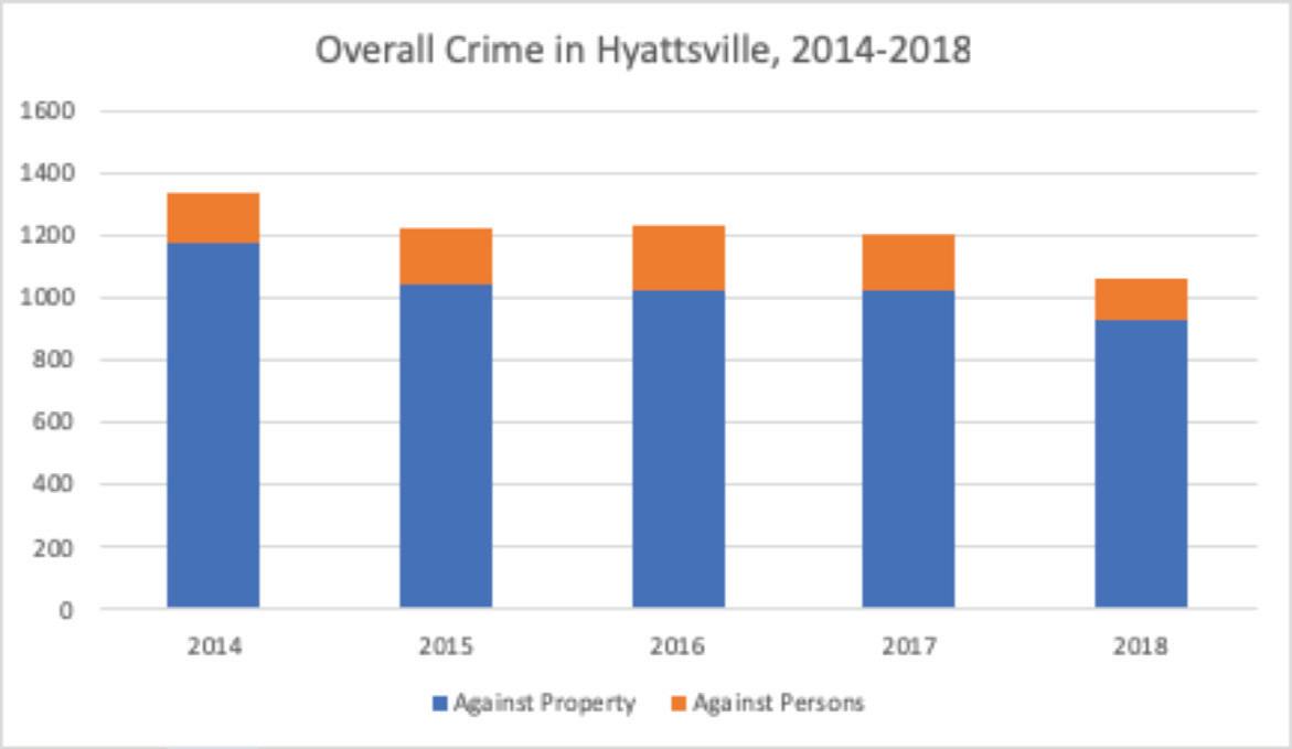 Hyattsville rang in the new year with a shooting near Hyattsville Middle School. On Jan. 2, Hyattsville City Police Department (HCPD) officers responded to a call about gunshots in the vicinity of 4200 Nicholson Street. HCPD reported that two people armed with semiautomatic handguns exchanged gunfire and fled the scene before police arrived. However, overall crime — including most gun-related crime — has been trending downwards in Hyattsville. Although the more in-depth HCPD 2018 annual department report will be released within a month or so, according to HCPD Public
