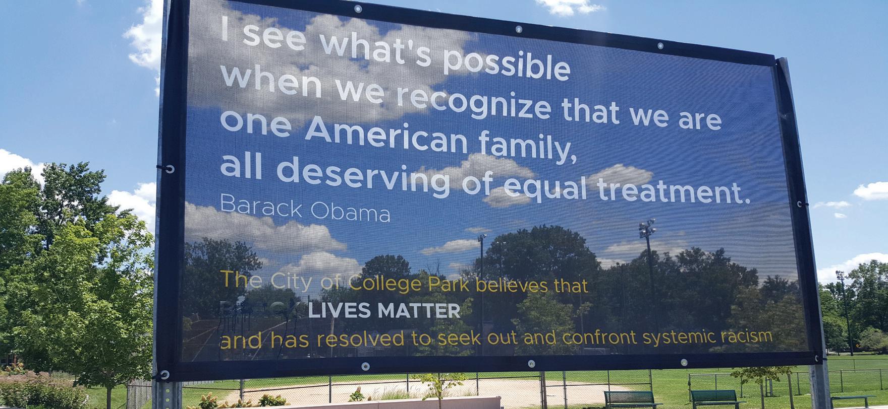 The City of College Park raised three signs on Duvall Field that were visible from Rhode Island Avenue. The signs included quotes and this statement: “The City of College Park believes that BLACK LIVES MATTER and has resolved to seek out and confront systemic racism.”