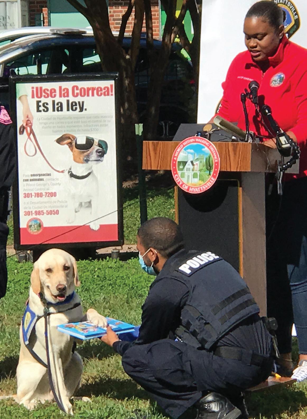 Nola, the police department’s new facility dog, attended the City of Hyattsville’s Grab n’ Go Treat-O-Rama at Heurich Park on Oct. 31. See more Halloween photos on pgs. 8 and 9, and learn more about Nola on p. 4. JULIA NIKHINSON