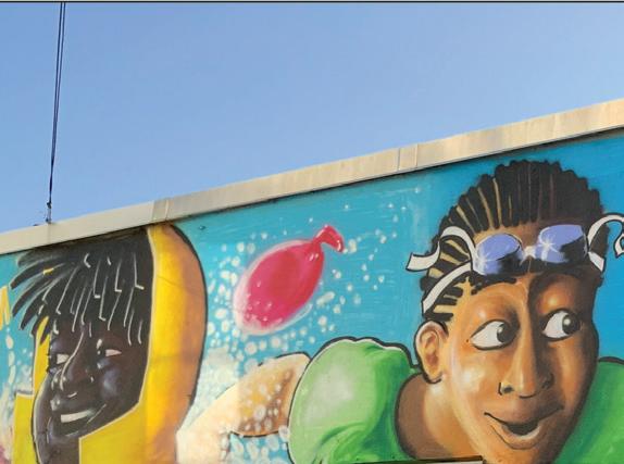 Water Balloon Dance, by Daniel Katz-Hernandez, is between K&W Auto and Streetcar 82 near Route 1. Inspired by the Black Lives Matter movement, it shows three Black kids having a fun water balloon fight.