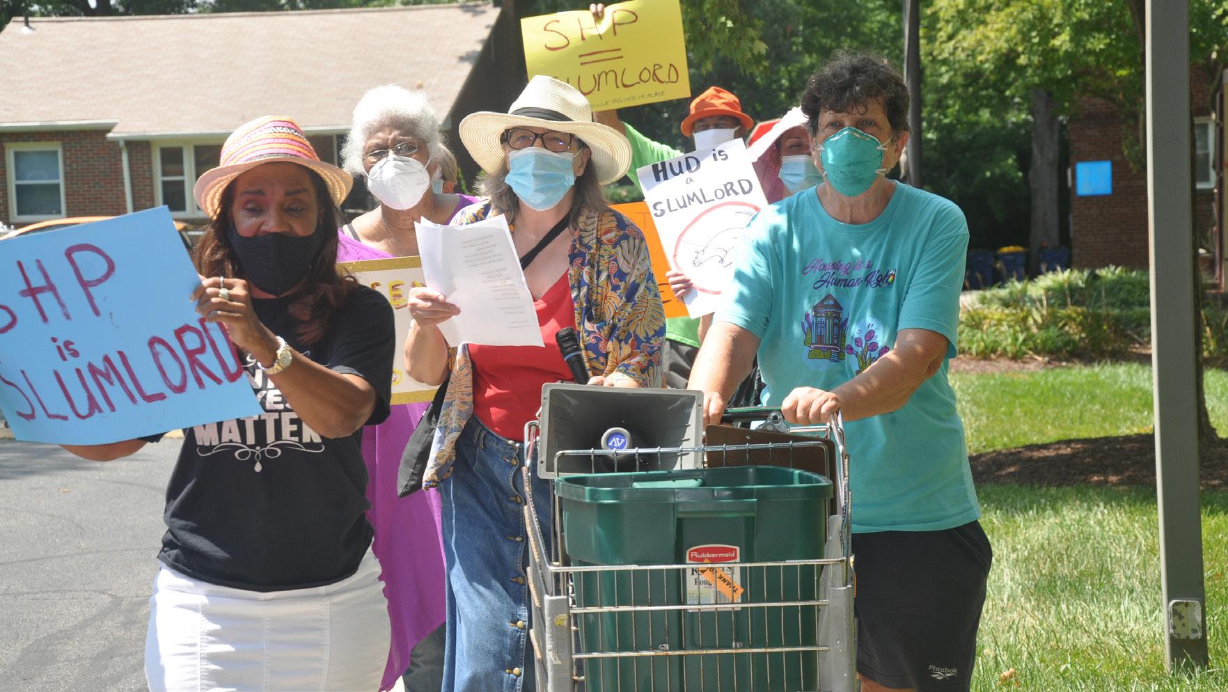 Members of the Friendship Arms Tenants’ Association and Hyattsville Aging in Place rally on Aug. 11 to protest conditions in the building. KIT SLACK