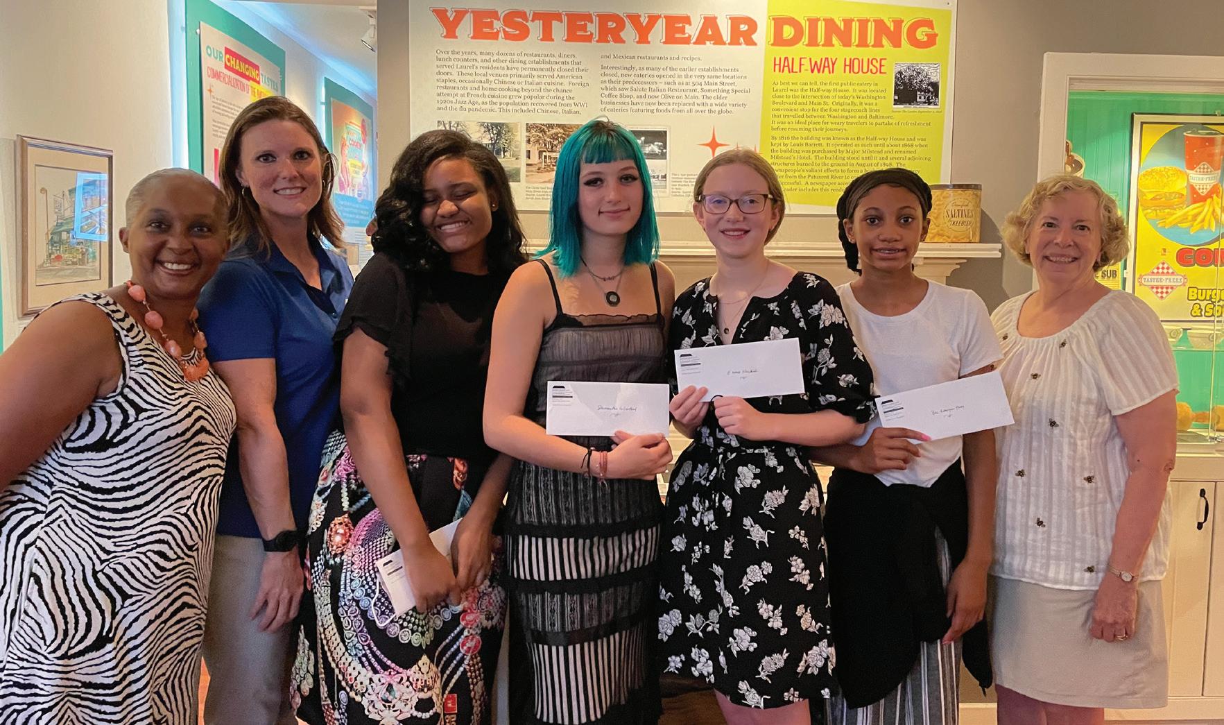 Keenashae Pennicooke, Laurel High School graduate; Samantha Lilienthal, Sandy Spring Friends School graduate; Emma Newkirk, Elizabeth Seton High School graduate; Brie Young, Chesapeake Math & IT Academy High School student; and Karen Lubieniecki, LHS board chair. Missing from photo: Scholarship winner Eamon Coyle, an Atholton High School graduate. COURTESY OF RILEIGH MATSON/LHS