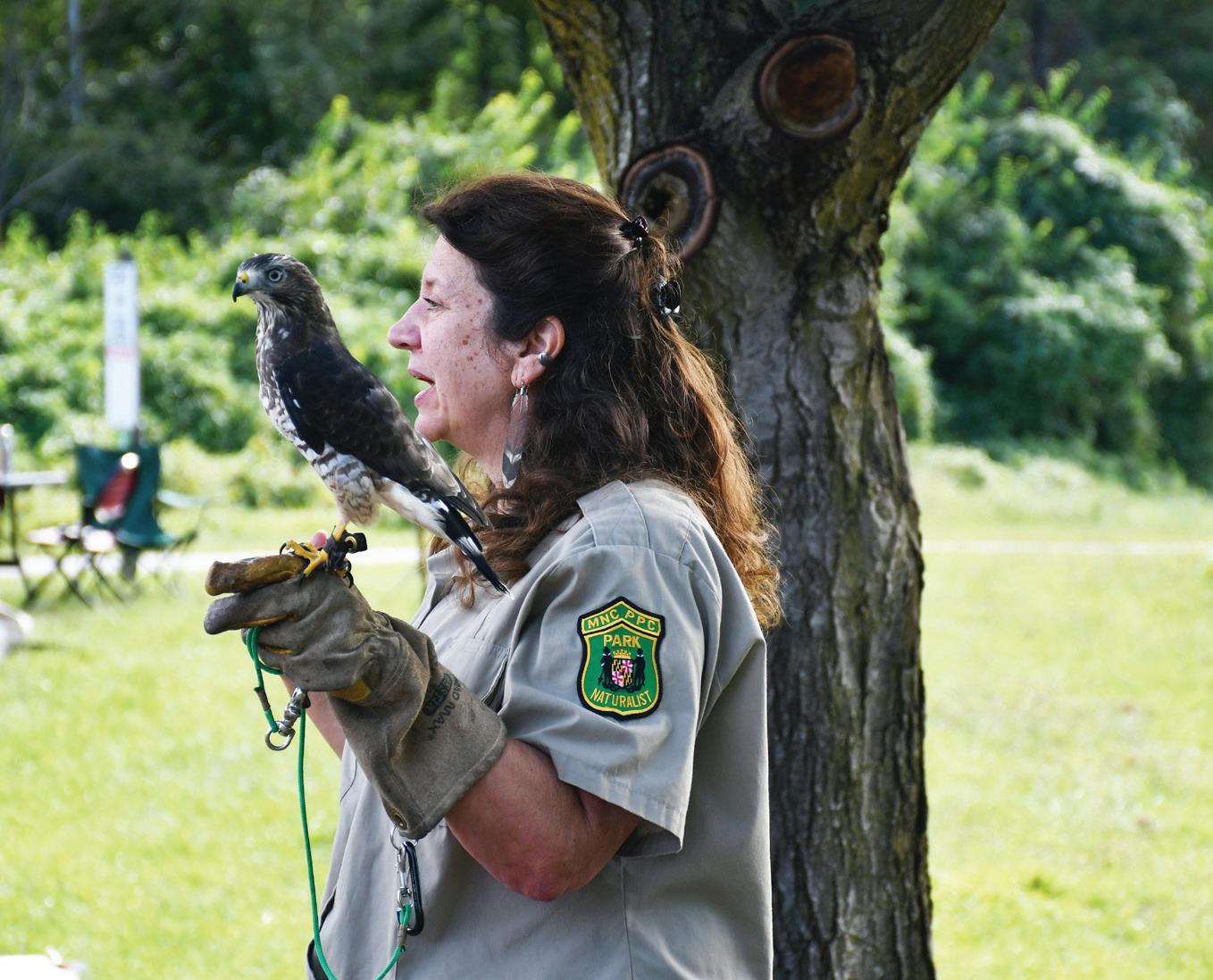 Paula McNeil is a professional bird trainer with the Watkins Youth Birding Club, which is sponsored by the Maryland-National Capital Park and Planning Commission. McNeil offered a birds-of-prey presentation featuring a broad winged hawk, a barred owl and a red tailed hawk at the event. McNeil uses her expertise as a bird trainer to engage youth in educational activities about birds.