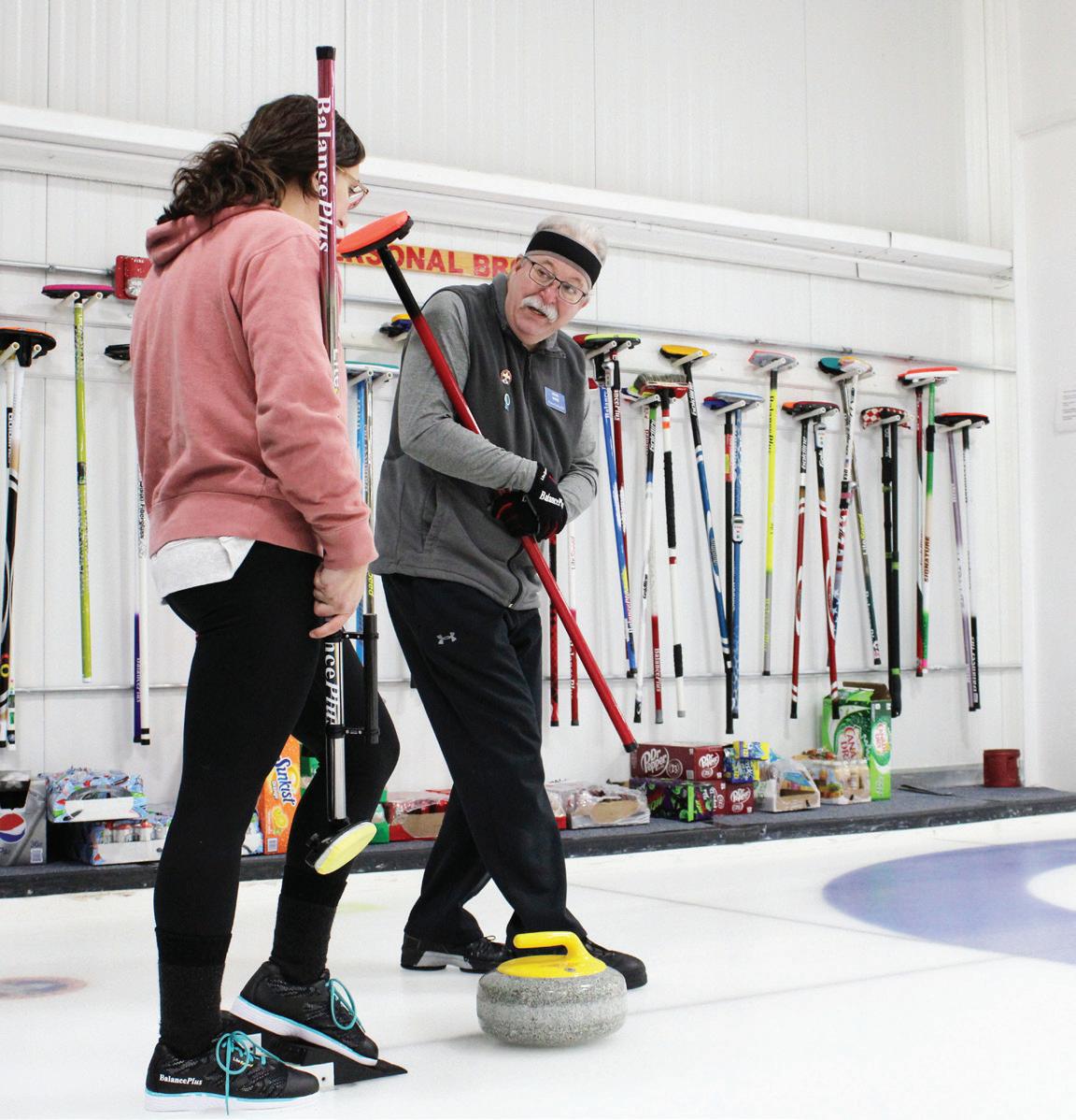 Coordinator Kevin White provides tips on how to slide the rock down the ice. LAUREN REEDER