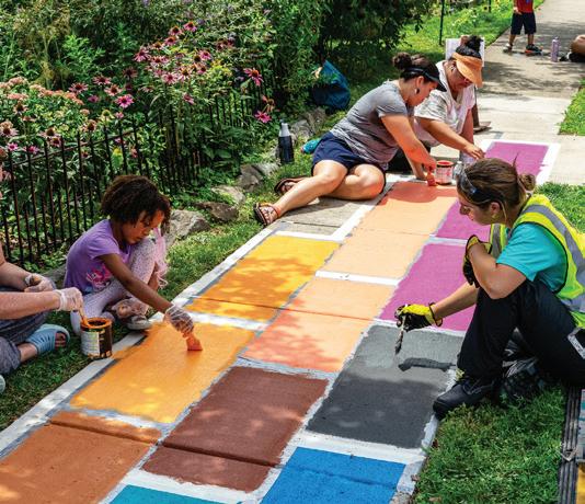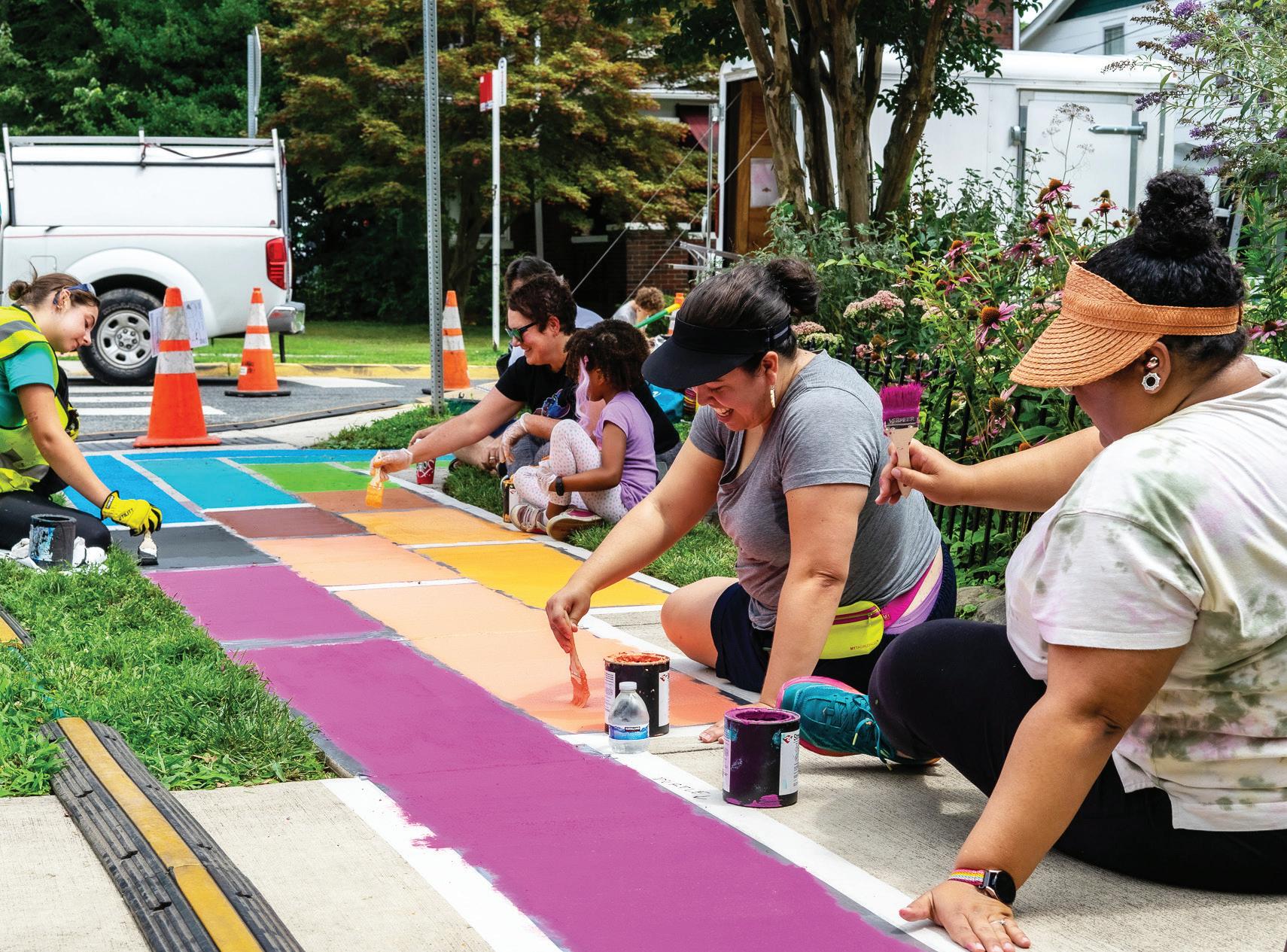 On July 22, dozens of Hyattsville residents joined artists from Graham Projects to restore and expand the street art piece, “Quilted Crossing,” at the intersection of Jefferson Street and 40th Avenue after it was vandalized in June. FREDDY WOLFE
