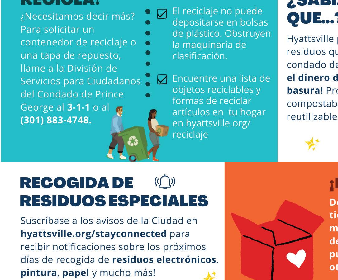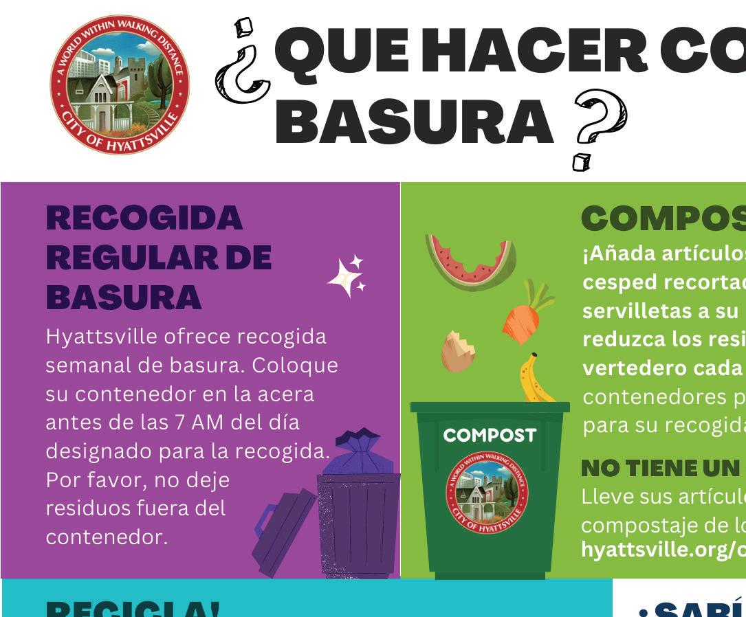 Issue 425| August 2023 THE CITY OF HYATTSVILLE The City recently delivered green compost toters to all households that Hyattsville City waste services. Composting place Mondays simply leave the bin curbside a.m. If new to the composting world, don’ts to help you get started. comprehensive list, visit hyattsville.org/compost. Do Fruits vegetables Bread, rice (no raw dough) Coffee grounds Soiled paper boxes (recyle if possible) Dairy products Yard waste (container able to close) Do NOT Compost Trash or recyclable items Fats, oils, and grease waste or construction Styrofoam La Ciudad recientemente entregó contenedores de compostaje verdes de 35 galones los hogares que reciben servicios de basura de la Ciudad Hyattsville. Las recogidas de compostaje toman plazo simplemente deje el contenedor a.m. Si eres nuevo mundo del compostaje, continuación hay una lista de cosas que hacer y no hacer para comenzar. Para obtener una lista más completa, visite hyattsville.org/compost. Compostar Frutas y vegetables pasta arroz (sin masa cruda) huesos Residuos filtros de café cajas de papel sucias (recicle si lácteos Residuos (el contenedor debe poder cerrarse) se Puede Basura regular artículos recicables Grasas y aceites Desechos Tierra construcción COMPOST TOTERS HAVE ARRIVED! The Hyattsville Reporter ¡LOS CONTENEDORES DE COMPOSTAJE HAN LLEGADO! INSIDE HYATTSVILLE’S AWARD-WINNING COMMUNITY NEWSPAPER VOL. 20 NO. 8 Hyattsville Life & Times PO Box 132 Hyattsville, MD 20781 NONPROFIT ORG U.S. POSTAGE PAID HYATTSVILLE MD PERMIT NO. 1383 OVERDUE AUDITS: A continuing look at city finances, P. 3 MORE ON PGCPS: Meet the new superintendent, P. 12 Community repaints public art following vandalism SEE TRAFFIC ON 7 Clear