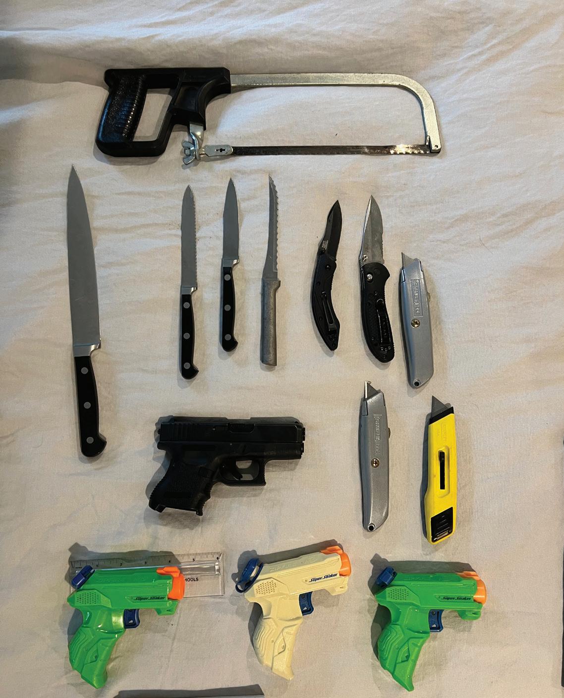 We hid various weapons, including a Glock 27, three pocket pistol-sized toy guns, a long knife, three box-cutters, two tactical knives, and a hacksaw, in a student’s clear backpack using only basic school supplies.