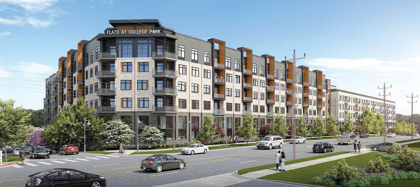 Flats at College Park will stand on Route 1 between Delaware and Cherokee streets, where the Days Inn and Red Roof Inn were demolished in February. With the aging hotels gone, RST Development of Rockville is preparing the plot to begin construction.