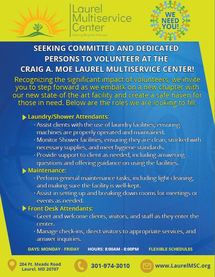 Fish of Laurel Food Pantry. Thursday and Saturday, from 10:15 a.m. to noon, 308 Gorman Ave. By appointment only; call 240.547.9013