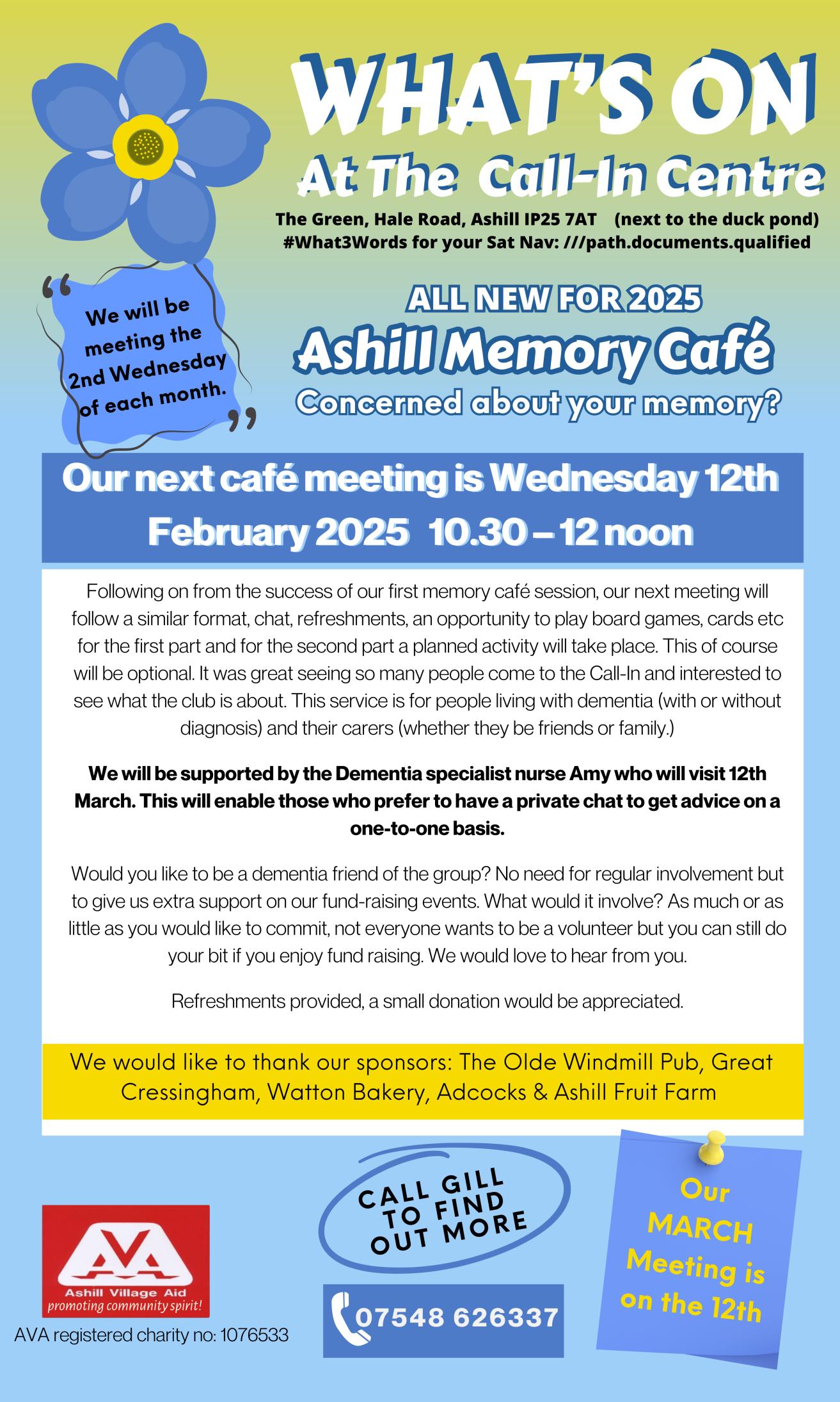 We want to say a big thank you to everyone who supported and contributed to our launch day of the Memory café at the Call‐In on 4 Dec. It was very well attended with people coming from Ashill as well those living in surrounding villages. We had some very generous donations for our raffle as well as commitment going forward from a couple of businesses which will help strengthen our aims to deliver as best a service as we can. The event was held in order to publicise this new initiative and let people know what kind of support they can expect to receive. The aim is to sign post, advise and listen to those living with Dementia and their loved ones. The sessions will run once a month initially on the second Wednesday of each month, 1030‐1200 at the Ashill Call‐In.