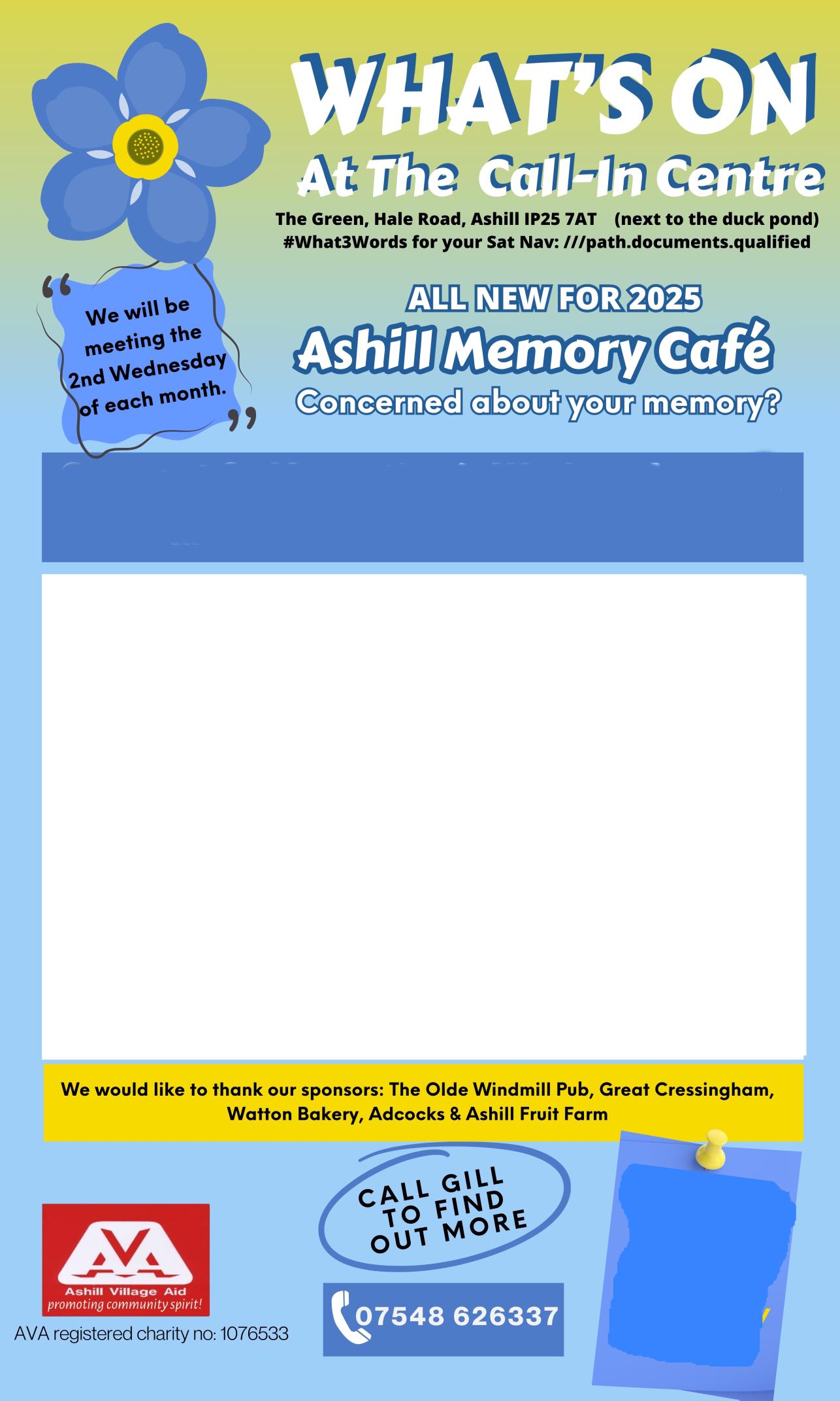 MEMORY CAFE from the 8th January, every second Wed of the month from 10.30 1200 Further information telephone 0754 862 6337.