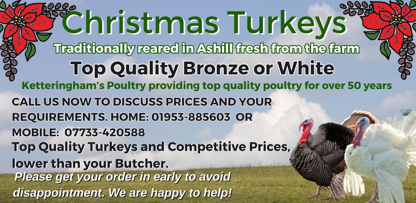 Peddars View Turkeys and Lamb Whole or halves supplied to order Prepared ready for the freezer. Fresh from the farm in Ashill. A Ketteringham. Telephone 01953 885603. Mobile 0773 3420588