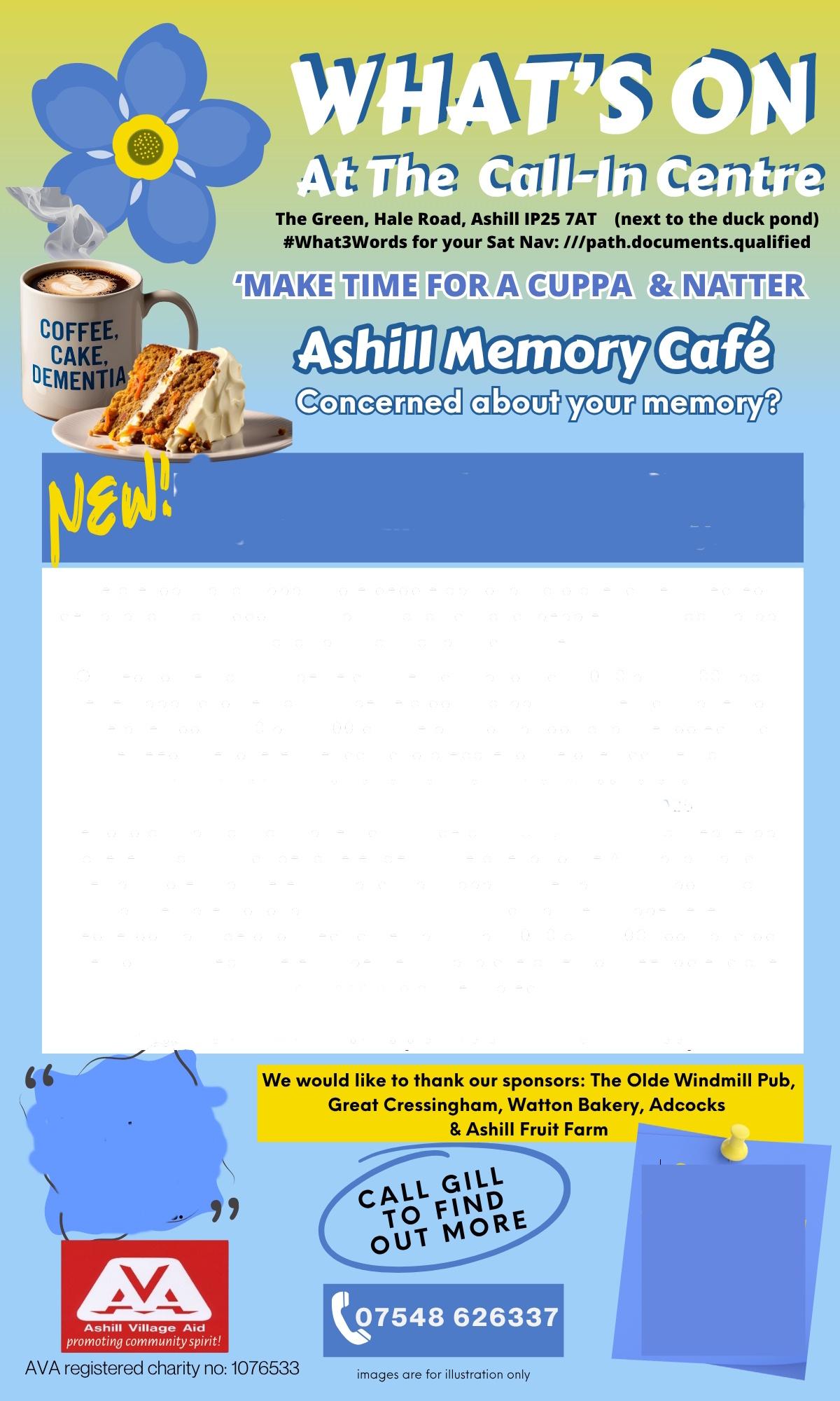 The memory cafe will now be open every Wednesday 10.30‐ 12 for drop in sessions . We are hoping to support people who live alone and feeling socially isolated as well as those concerned about their memory . The second Wednesday of the month however now has 2 sessions to accommodate our growing number of people wanting to attend our group and get support . The first one is full but there are spaces in the afternoon 12.30‐2 pm . If you think you might want to come along then please get in touch . For info please call Gill 07548626337