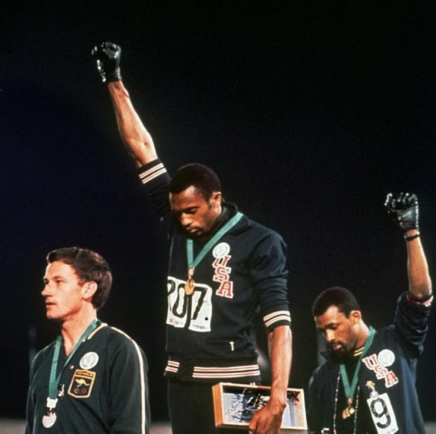 BUT GOLD MEDAL WINNER SMITH AND BRONZE MEDALIST AND OLYMPIC TEAMMATE JOHN CARLOS ARE REMEMBERED FOR THEIR MEDAL PODIUM PROTEST AT THE MEXICO CITY GAMES.