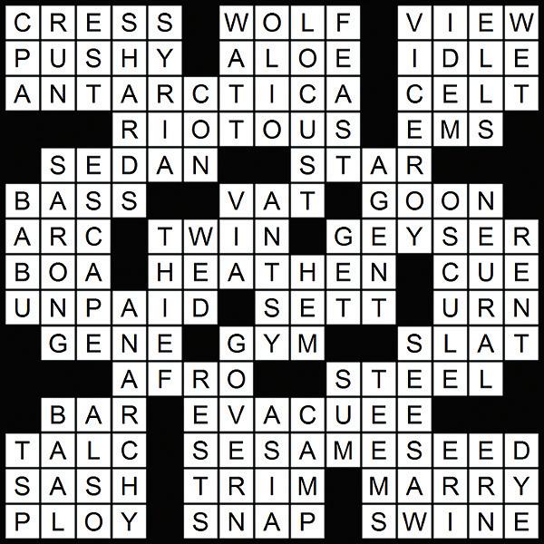 solve the Sudoku puzzle, each row, column and box must contain the Copyright ©2016 PuzzleJunction.com Sudoku Solution 1 to 9. ©2016 PuzzleJunction.com Solution 33 Criminal 34 Unite 35 “___ lost!” 36 Hire 39 Fashion line 42 Chaos 46 Rule 47 It has its ups and downs 49 Takes five 50 Total 51 Swarms 52 Canaanite deity 53 Besides 55 Part of SEATO 56 Bivouac 57 Recipe amt. 59 “___ tu” (aria for Renato) 60 Seabird 61 Food additive 54 Flood victim, at times 57 After-bath powder 58 Oil source 62 Cummerbund 63 Quick cut 64 Get a wife 65 Gambit 66 Jacket fastener 67 Lowlife Down 1 Tax pro, for short 2 Seek a seat 3 “Humanum ___ errare” 4 Fragments 5 Neighbor of Turkey 6 Light bulb unit 7 Mishmash 8 Crop eater 9 Spread 10 Monarch butterfly’s smaller kin 11 Footnote word 12 Extensions 13 Soaked 18 Hoodwink 22 South Seas attire 23 Break loose 25 Deal maker 26 Hindu Mr. 27 By way of 28 Impatient 30 Sponge opening 31 Kind of network last week's answers Streetwise 3/3/24 Crossword PuzzleJunction.com ©2024 PuzzleJunction.com 32 White House nickname 34 Mason’s burden 35 Relative of reggae 36 Symbols of industry 37 Great Plains tribe 38 Iranian